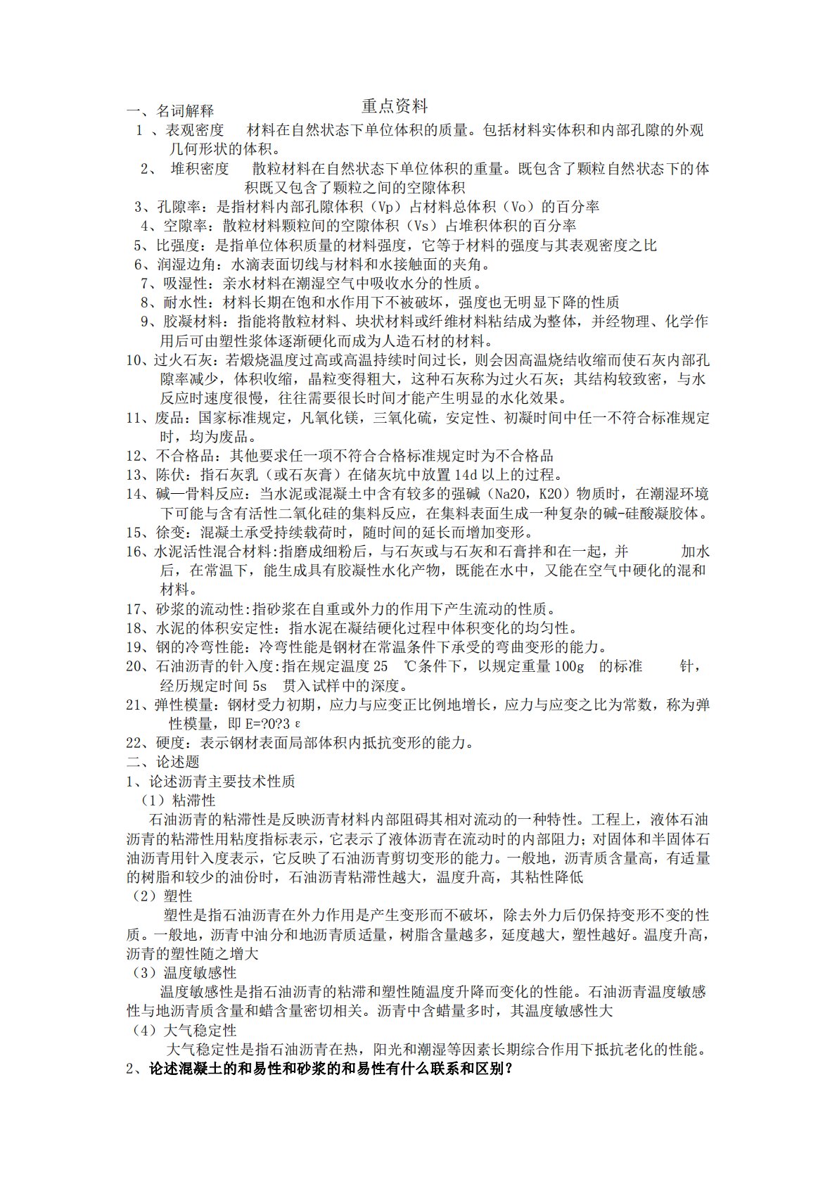 一、名词解释1、表观密度材料在自然状态下单位体积的质量。包括材料实体积和内部孔隙的外观几何形状的体积。2、堆积密度散粒材料在自然状态下单位体积的重量。既包含了颗粒自然状态下的体积既又包含了颗粒之间的空隙体积3、孔隙率:是指材料内部孔隙体积(Vp)占材料总体积(Vo)的百分率4、空隙率:散粒材料颗粒间的空隙体积(Vs)占堆积体积的百分率5、比强度:是指单位体积质量的材料强度,它等于材料的强度与其表观密度之比6、润湿边角:水滴表面切线与材料和水接触面的夹角。7、吸湿性:亲水材料在潮湿空气中吸收水分的性质。8、耐水性:材料长期在饱和水作用下不被破坏,强度也无明显下降的性质9、胶凝材料:指能将散粒材料...