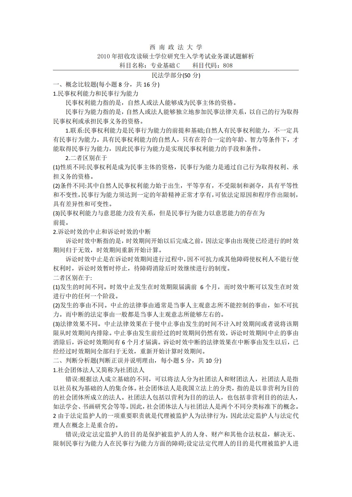 西南政法大学2010年招收攻读硕士学位研究生入学考试业务课试题解析科目名称:专业基础C科目代码:808民法学部分(50分)一、概念比较题(每小题8分,共16分)1.民事权利能力和民事行为能力民事权利能力指的是,自然人或法人能够成为民事主体的资格。民事行为能力指的是,自然人或法人能够独立地参加民事法律关系,以自己的行为取得民事权利或承担民事义务的资格。1.联系:民事权利能力是民事行为能力的前提和基础;自然人有民事权利能力,不一定具有民事行为能力。具有民事权利能力的自然人,只有在符合一定的年龄、智力等条件下,才能取得民事行为能力,因此民事行为能力是实现民事权利能力的手段和条件。2.二者区别在于(1...