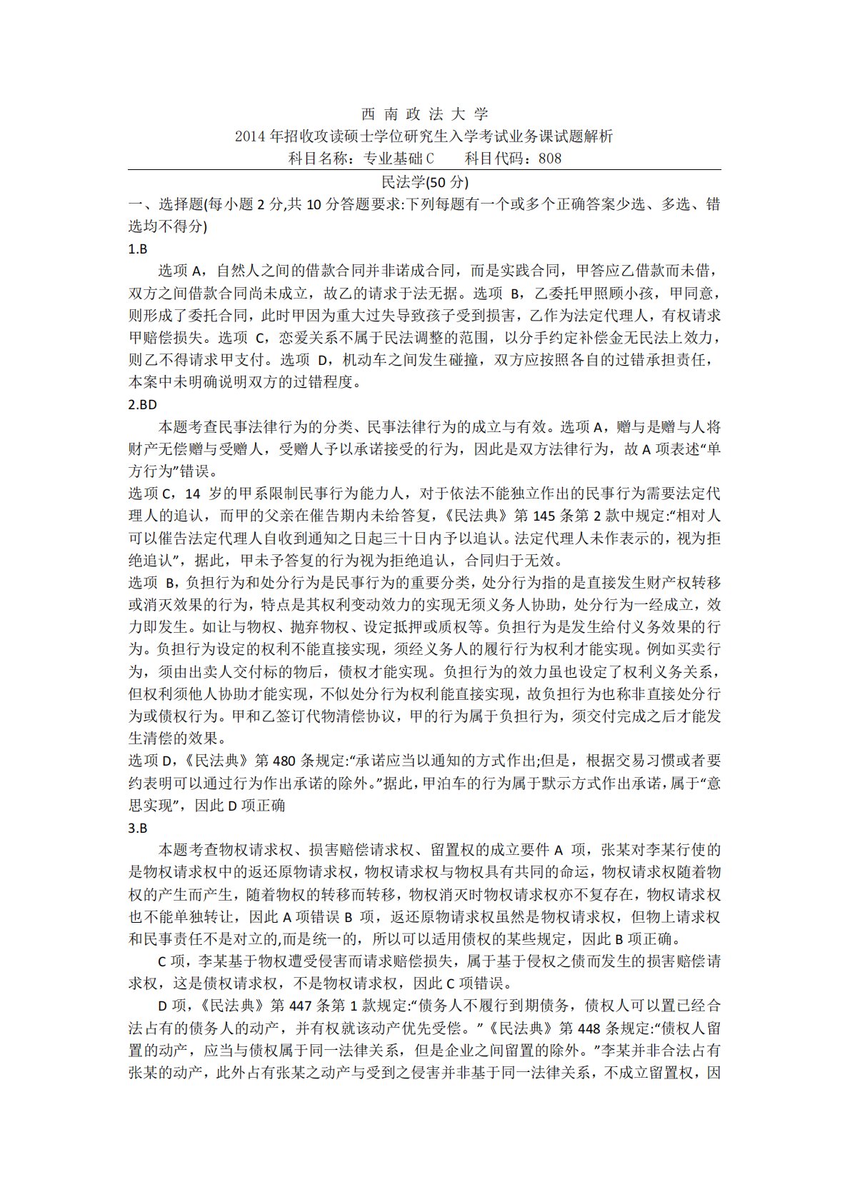 西南政法大学2014年招收攻读硕士学位研究生入学考试业务课试题解析科目名称:专业基础C科目代码:808民法学(50分)一、选择题(每小题2分,共10分答题要求:下列每题有一个或多个正确答案少选、多选、错选均不得分)1.B选项A,自然人之间的借款合同并非诺成合同,而是实践合同,甲答应乙借款而未借,双方之间借款合同尚未成立,故乙的请求于法无据。选项B,乙委托甲照顾小孩,甲同意,则形成了委托合同,此时甲因为重大过失导致孩子受到损害,乙作为法定代理人,有权请求甲赔偿损失。选项C,恋爱关系不属于民法调整的范围,以分手约定补偿金无民法上效力,则乙不得请求甲支付。选项D,机动车之间发生碰撞,双方应按照各自的...