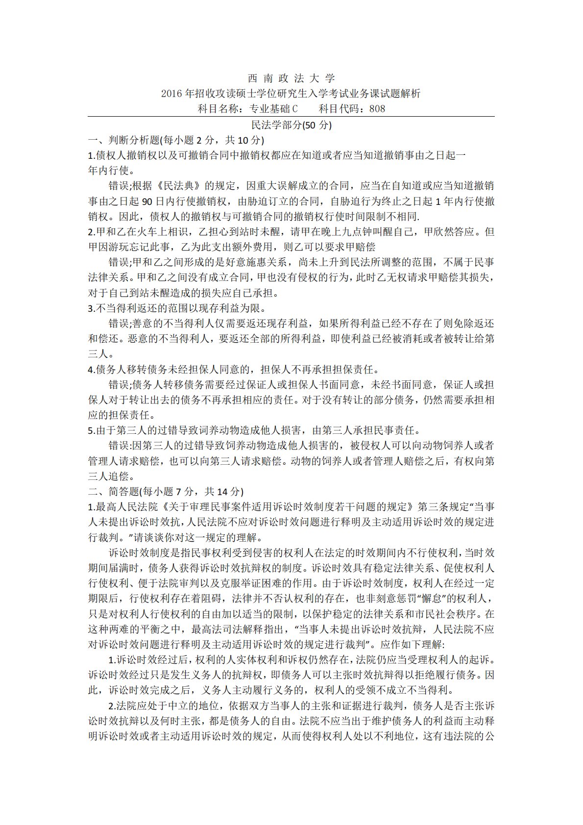 西南政法大学2016年招收攻读硕士学位研究生入学考试业务课试题解析科目名称:专业基础C科目代码:808民法学部分(50分)一、判断分析题(每小题2分,共10分)1.债权人撤销权以及可撤销合同中撤销权都应在知道或者应当知道撤销事由之日起一年内行使。错误;根据《民法典》的规定,因重大误解成立的合同,应当在自知道或应当知道撤销事由之日起90日内行使撤销权,由胁迫订立的合同,自胁迫行为终止之日起1年内行使撤销权。因此,债权人的撤销权与可撤销合同的撤销权行使时间限制不相同.2.甲和乙在火车上相识,乙担心到站时未醒,请甲在晚上九点钟叫醒自己,甲欣然答应。但甲因游玩忘记此事,乙为此支出额外费用,则乙可以要求...