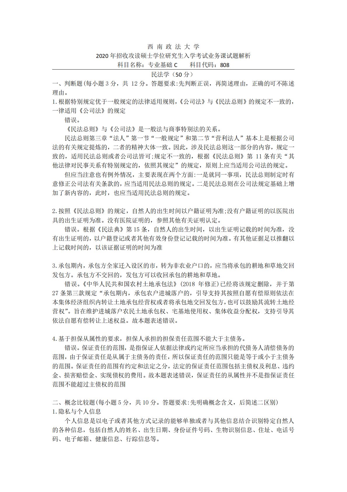 西南政法大学2020年招收攻读硕士学位研究生入学考试业务课试题解析科目名称:专业基础C科目代码:808民法学(50分)一、判断题(每小题3分,共12分。答题要求:先判断正误,再简述理由,正确的可不陈述理由。1.根据特别规定优于一般规定的法律适用规则,《公司法》与《民法总则》的规定不一致的,一律适用《公司法》的规定错误。《民法总则》与《公司法》是一般法与商事特别法的关系。民法总则第三章“法人”第一节“一般规定”和第二节“营利法人”基本上是根据公司法的有关规定提炼的,二者的精神大体一致。因此,涉及民法总则这一部分的内容,规定一致的,适用民法总则或者公司法皆可;规定不一致的,根据《民法总则》第11条...