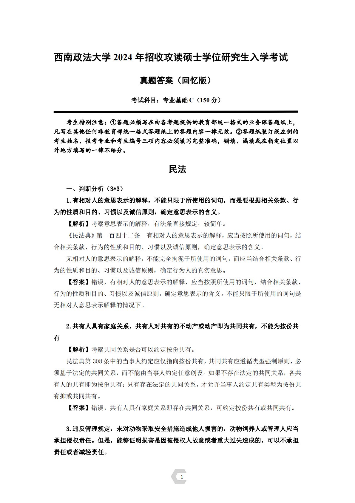 1西南政法大学2024年招收攻读硕士学位研究生入学考毓才考研试真题答案(回忆版)考试科目:专业基础C(150分)考生特别注意:①答题必须写在由各考题提供的教育部统一格式的业务课答题纸上,凡写在其他任何非教育部统一格式答题纸上的答题内容一律无效。②答题纸装订线左侧的考生姓名、报考专业和考生编号三项内容必须填写完整准确,错填、漏填或在指定位置以外地方填写的一律不给分。民法一、判断分析(3*3)1.有相对人的意思表示的解释,不能只限于所使用的词句,而是要根据相关条款、行为的性质和目的、习惯以及诚信原则,确定意思表示的含义。【解析】考察意思表示的解释,有法条直接规定,较简单。《民法典》第一百四十二条有...