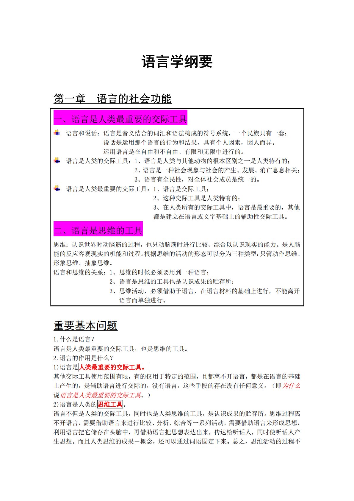 语言学纲要第一章语言的社会功能一、语言是人类最重要的交际工具语言和说话:语言是音义结合的词汇和语法构成的符号系统,一个民族只有一套;说话是运用那个语言的行为和结果,具有个人因素,因人而异。运用语言是在自由和不自由、有限和无限中进行的。语言是人类的交际工具:1、语言是人类与其他动物的根本区别之一是人类特有的;2、语言是一种社会现象与社会的产生、发展、消亡息息相关;3、语言有全民性,对全体社会成员是统一的。语言是人类最重要的交际工具:1、语言是交际工具;2、这种交际工具是人类特有的;3、在人类所有的交际工具中,语言是最重要的,其他都是建立在语言或文字基础上的辅助性交际工具。二、语言是思维的工具思维...