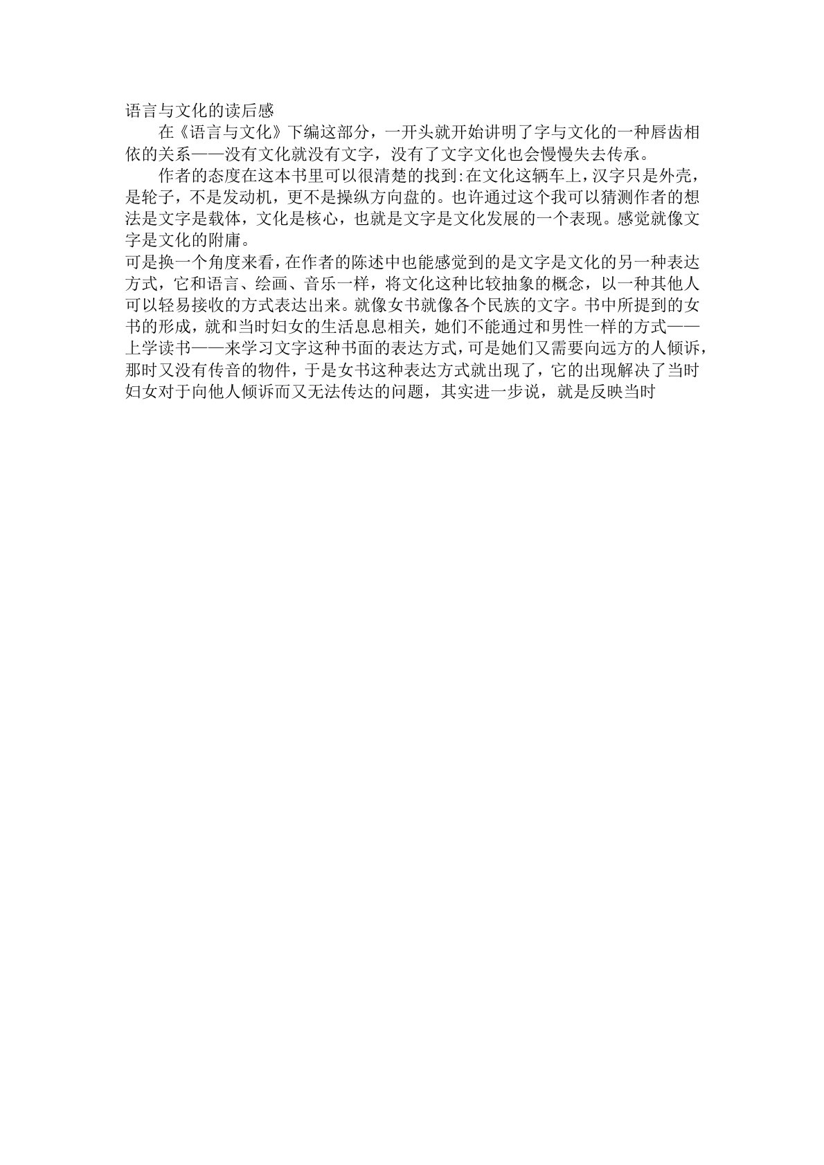 语言与文化的读后感在《语言与文化》下编这部分,一开头就开始讲明了字与文化的一种唇齿相依的关系——没有文化就没有文字,没有了文字文化也会慢慢失去传承。作者的态度在这本书里可以很清楚的找到:在文化这辆车上,汉字只是外壳,是轮子,不是发动机,更不是操纵方向盘的。也许通过这个我可以猜测作者的想法是文字是载体,文化是核心,也就是文字是文化发展的一个表现。感觉就像文字是文化的附庸。可是换一个角度来看,在作者的陈述中也能感觉到的是文字是文化的另一种表达方式,它和语言、绘画、音乐一样,将文化这种比较抽象的概念,以一种其他人可以轻易接收的方式表达出来。就像女书就像各个民族的文字。书中所提到的女书的形成,就和当时...