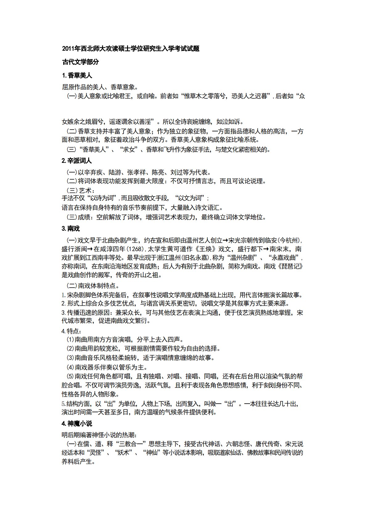 2011年西北师大攻读硕士学位研究生入学考试试题古代文学部分1.香草美人屈原作品的美人、香草意象。(一)美人意象或比喻君王,或自喻。前者如“惟草木之零落兮,恐美人之迟暮”,后者如“众女嫉余之娥眉兮,谣逐谓余以善淫”。所以全诗哀婉缠绵,如泣如诉。(二)香草支持并丰富了美人意象;作为独立的象征物,一方面指品德和人格的高洁,一方面和恶草相对,象征着政治斗争的双方。香草美人意象构成象征比喻系统。(三)“香草美人”、“求女”、香草和飞升作为象征手法,与楚文化紧密相关的。2.辛派词人(一)以辛弃疾、陆游、张孝祥、陈亮、刘过等为代表。(二)将词体表现功能发挥到最大限度:不仅可抒情言志,而且可议论说理。(三)...