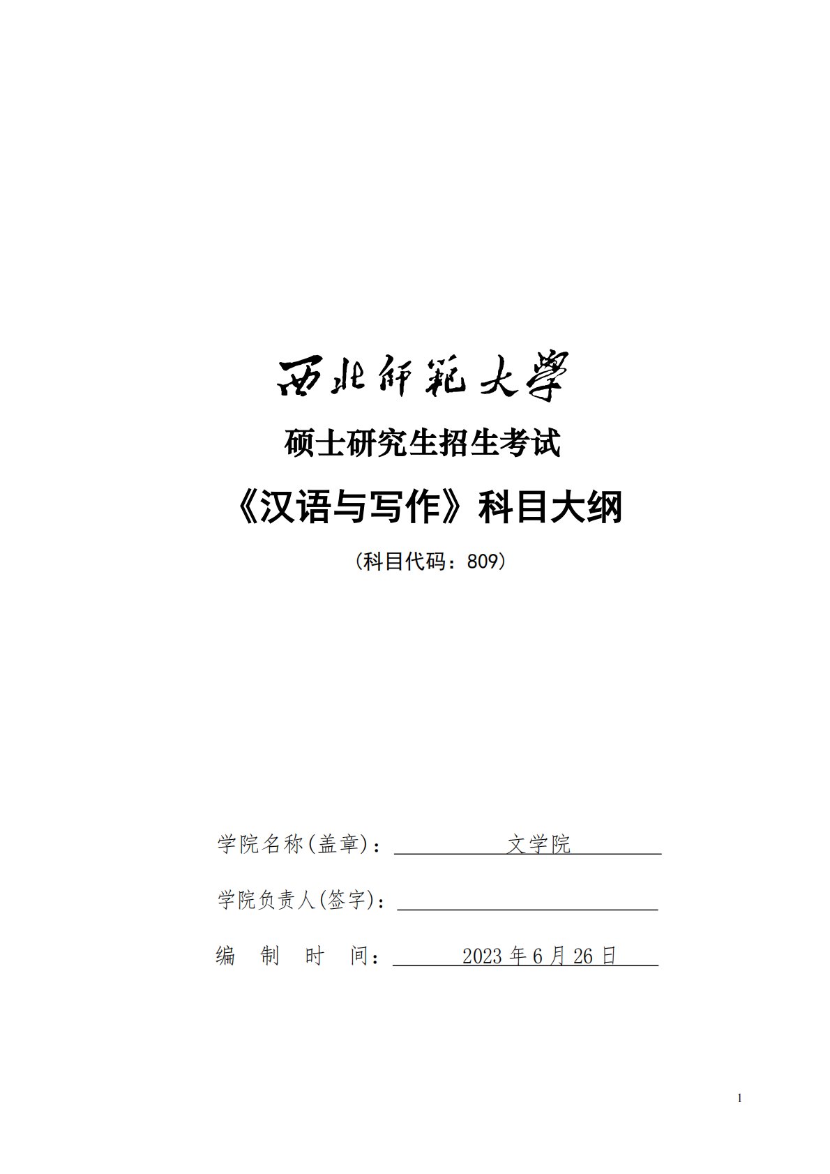 1硕士研究生招生考试《汉语与写作》科目大纲(科目代码:809)学院名称(盖章):文学院学院负责人(签字):编制时间:2023年6月26日2《汉语与写作》科目大纲(科目代码:809)《汉语与写作》满分共150分,其中《古代汉语》《现代汉语》和《写作》各占50分。《古代汉语》一、考核要求古代汉语是中国语言文学专业硕士研究生《汉语基础》科目入学考试的内容之一。本课程以中华书局版王力主编《古代汉语》教材为主要参考书,以第一、二册为重点考核内容。要求考生掌握古代汉语语音、词汇、语法、修辞以及汉字构造和工具书使用方面的基础知识,同时考察考生运用所学知识分析问题、解决问题的能力。此外,应有一定量的文言文阅读...