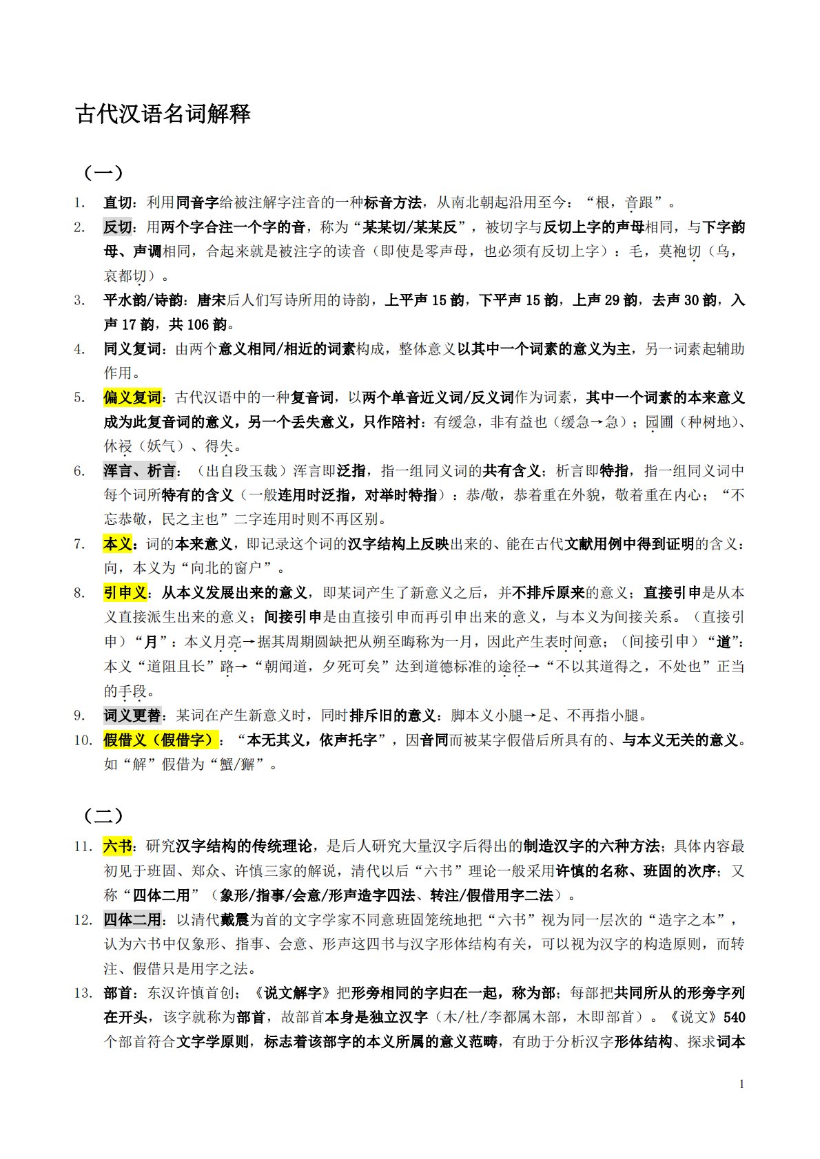 1古代汉语名词解释(一)1.直切:利用同音字给被注解字注音的一种标音方法,从南北朝起沿用至今:“根,音.跟”。2.反切:用两个字合注一个字的音,称为“某某切/某某反”,被切字与反切上字的声母相同,与下字韵母、声调相同,合起来就是被注字的读音(即使是零声母,也必须有反切上字):毛,莫袍切.(乌,哀都切.)。3.平水韵/诗韵:唐宋后人们写诗所用的诗韵,上平声15韵,下平声15韵,上声29韵,去声30韵,入声17韵,共106韵。4.同义复词:由两个意义相同/相近的词素构成,整体意义以其中一个词素的意义为主,另一词素起辅助作用。5.偏义复词:古代汉语中的一种复音词,以两个单音近义词/反义词作为词素,其...