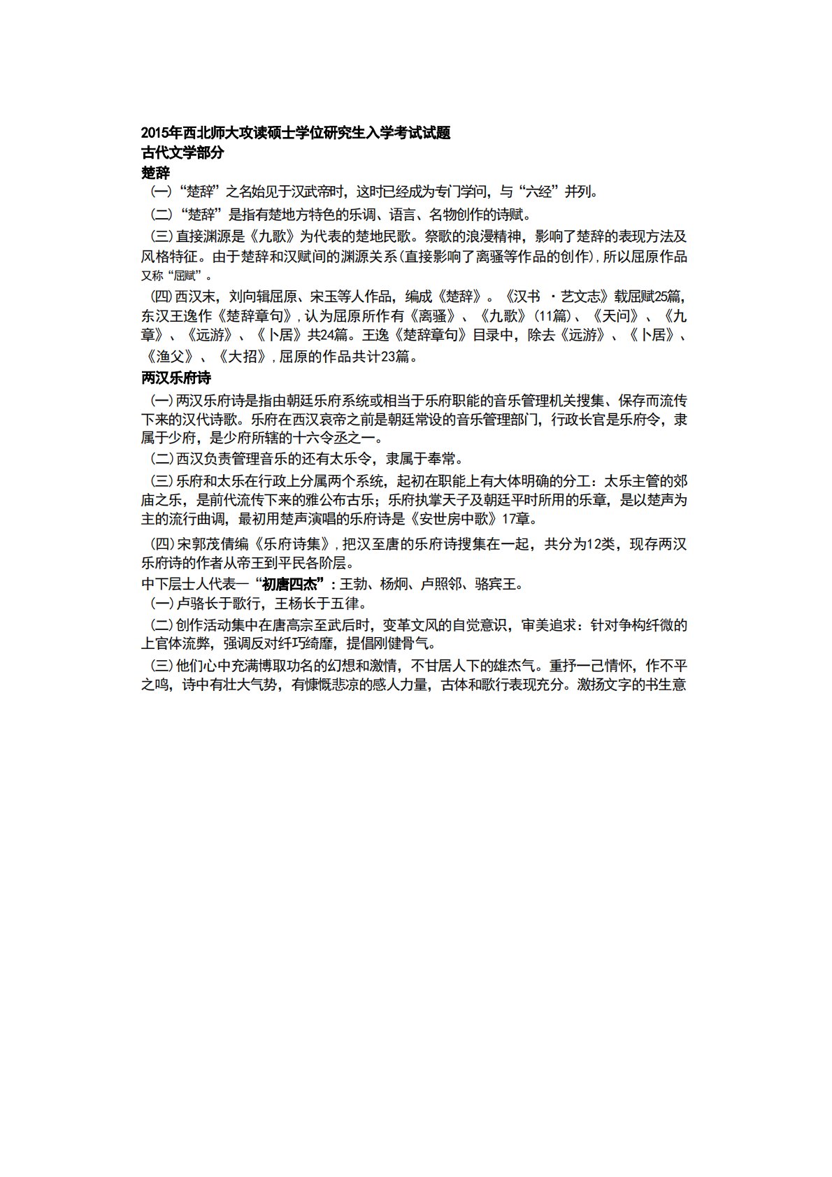 2015年西北师大攻读硕士学位研究生入学考试试题古代文学部分楚辞(一)“楚辞”之名始见于汉武帝时,这时已经成为专门学问,与“六经”并列。(二)“楚辞”是指有楚地方特色的乐调、语言、名物创作的诗赋。(三)直接渊源是《九歌》为代表的楚地民歌。祭歌的浪漫精神,影响了楚辞的表现方法及风格特征。由于楚辞和汉赋间的渊源关系(直接影响了离骚等作品的创作),所以屈原作品又称“屈赋”。(四)西汉末,刘向辑屈原、宋玉等人作品,编成《楚辞》。《汉书·艺文志》载屈赋25篇,东汉王逸作《楚辞章句》,认为屈原所作有《离骚》、《九歌》(11篇)、《天问》、《九章》、《远游》、《卜居》共24篇。王逸《楚辞章句》目录中,除去《...