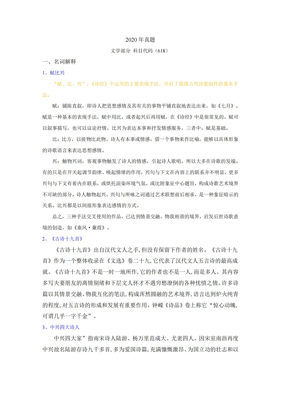 2020年真题文学部分科目代码(618)一、名词解释1、赋比兴“赋、比、兴”,《诗经》中运用的主要表现手法,开启了我国古代诗歌创作的基本手法。赋:铺陈直叙,即诗人把思想感情及其有关的事物平铺直叙地表达出来,如《七月》。赋是一种基本的表现手法,赋中用比,或者起兴后再用赋,在《诗经》中是很常见的。赋可以叙事描写,也可以议论抒情,比兴为表达本事和抒发情感服务,三者中,赋是基础。比:比方,以彼物比此物,诗人有本事或情感,借一个事物来作比喻,能够以具体形象的诗歌语言来表达思想感情。兴:触物兴词,客观事物触发了诗人的情感,引起诗人歌唱,所以大多在诗歌的发端。有的只是在开关起调节韵律、唤起情绪的作用,兴句与...