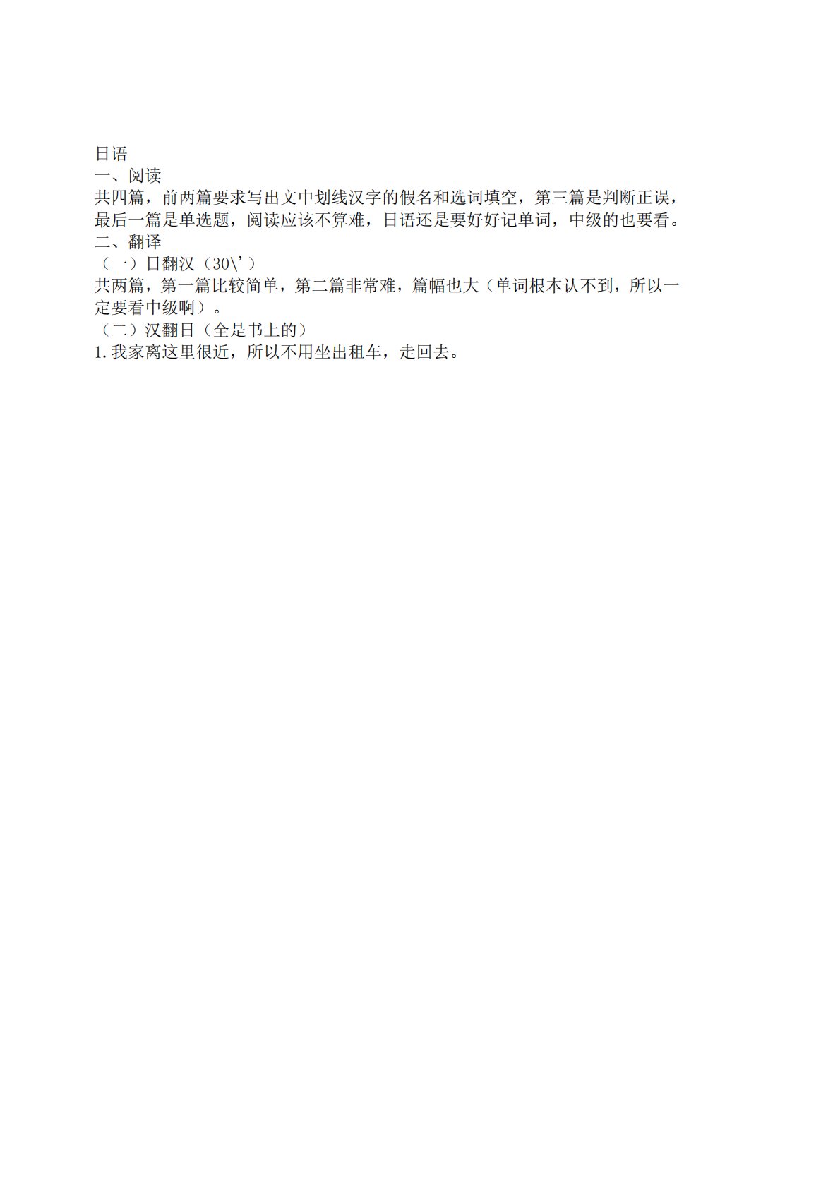 日语一、阅读共四篇,前两篇要求写出文中划线汉字的假名和选词填空,第三篇是判断正误,最后一篇是单选题,阅读应该不算难,日语还是要好好记单词,中级的也要看。二、翻译(一)日翻汉(30\')共两篇,第一篇比较简单,第二篇非常难,篇幅也大(单词根本认不到,所以一定要看中级啊)。(二)汉翻日(全是书上的)1.我家离这里很近,所以不用坐出租车,走回去。日语一、阅读共四篇,前两篇要求写出文中划线汉字的假名和选词填空,第三篇是判断正误,最后一篇是单选题,阅读应该不算难,日语还是要好好记单词,中级的也要看。二、翻译(一)日翻汉(30\')共两篇,第一篇比较简单,第二篇非常难,篇幅也大(单词根本认不到,所以一定要...