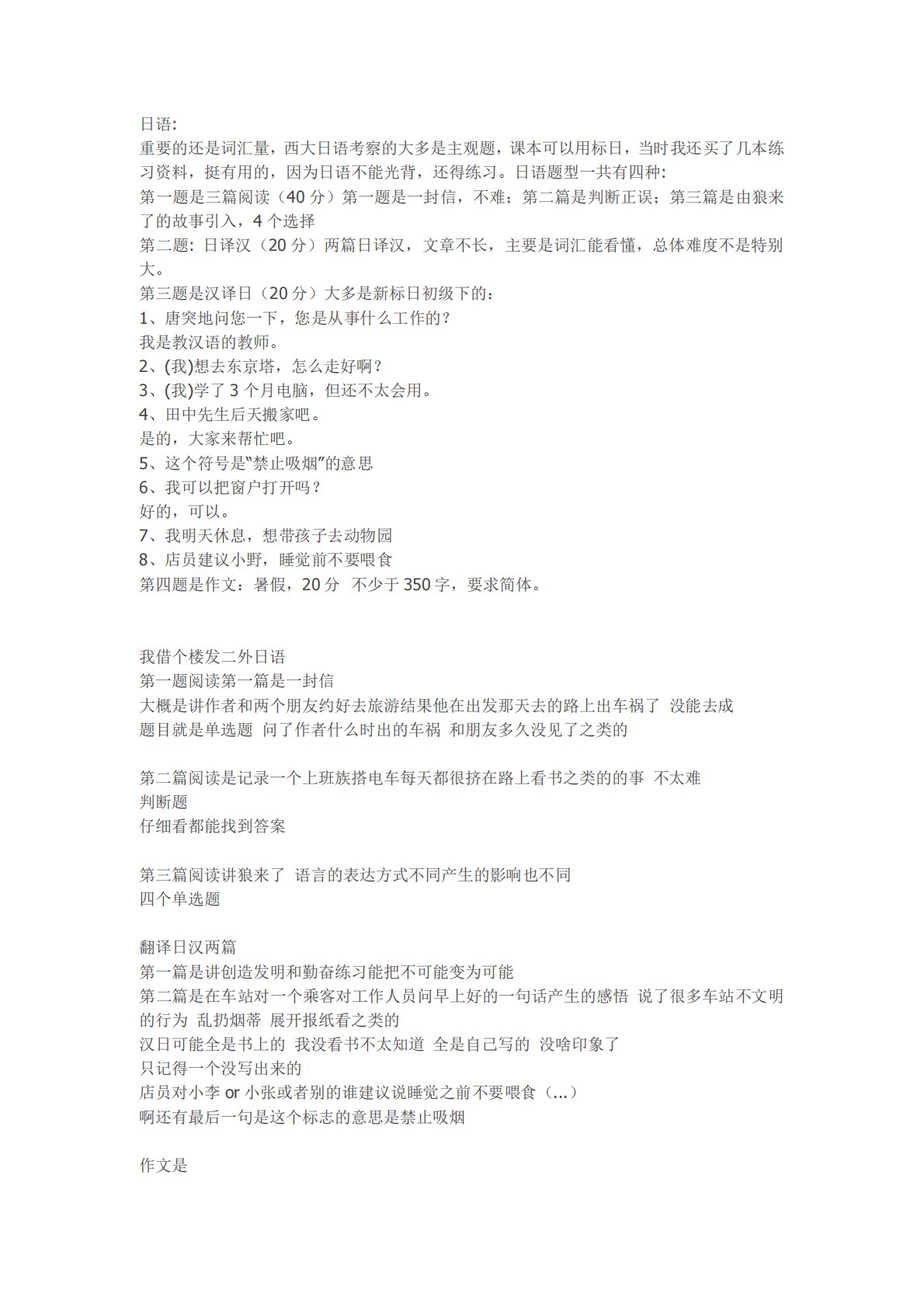 日语:重要的还是词汇量,西大日语考察的大多是主观题,课本可以用标日,当时我还买了几本练习资料,挺有用的,因为日语不能光背,还得练习。日语题型一共有四种:第一题是三篇阅读(40分)第一题是一封信,不难;第二篇是判断正误;第三篇是由狼来了的故事引入,4个选择第二题:日译汉(20分)两篇日译汉,文章不长,主要是词汇能看懂,总体难度不是特别大。第三题是汉译日(20分)大多是新标日初级下的:1、唐突地问您一下,您是从事什么工作的?我是教汉语的教师。2、(我)想去东京塔,怎么走好啊?3、(我)学了3个月电脑,但还不太会用。4、田中先生后天搬家吧。是的,大家来帮忙吧。5、这个符号是“禁止吸烟”的意思6、我可...
