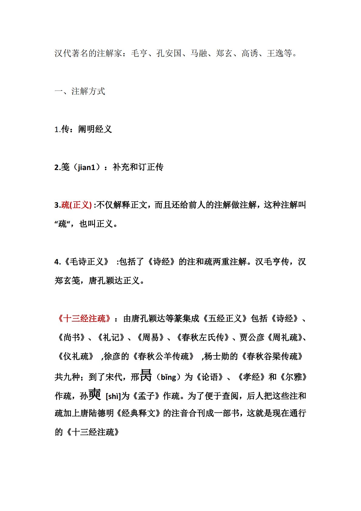 汉代著名的注解家:毛亨、孔安国、马融、郑玄、高诱、王逸等。一、注解方式1.传:阐明经义2.笺(jian1):补充和订正传3.疏(正义):不仅解释正文,而且还给前人的注解做注解,这种注解叫“疏“,也叫正义。4.《毛诗正义》:包括了《诗经》的注和疏两重注解。汉毛亨传,汉郑玄笺,唐孔颖达正义。《十三经注疏》:由唐孔颖达等篆集成《五经正义》包括《诗经》、《尚书》、《礼记》、《周易》、《春秋左氏传》、贾公彦《周礼疏》、《仪礼疏》,徐彦的《春秋公羊传疏》,杨士勋的《春秋谷梁传疏》共九种;到了宋代,邢昺(bǐng)为《论语》、《孝经》和《尔雅》作疏,孙奭[shì]为《孟子》作疏。为了便于查阅,后人把这些注和...
