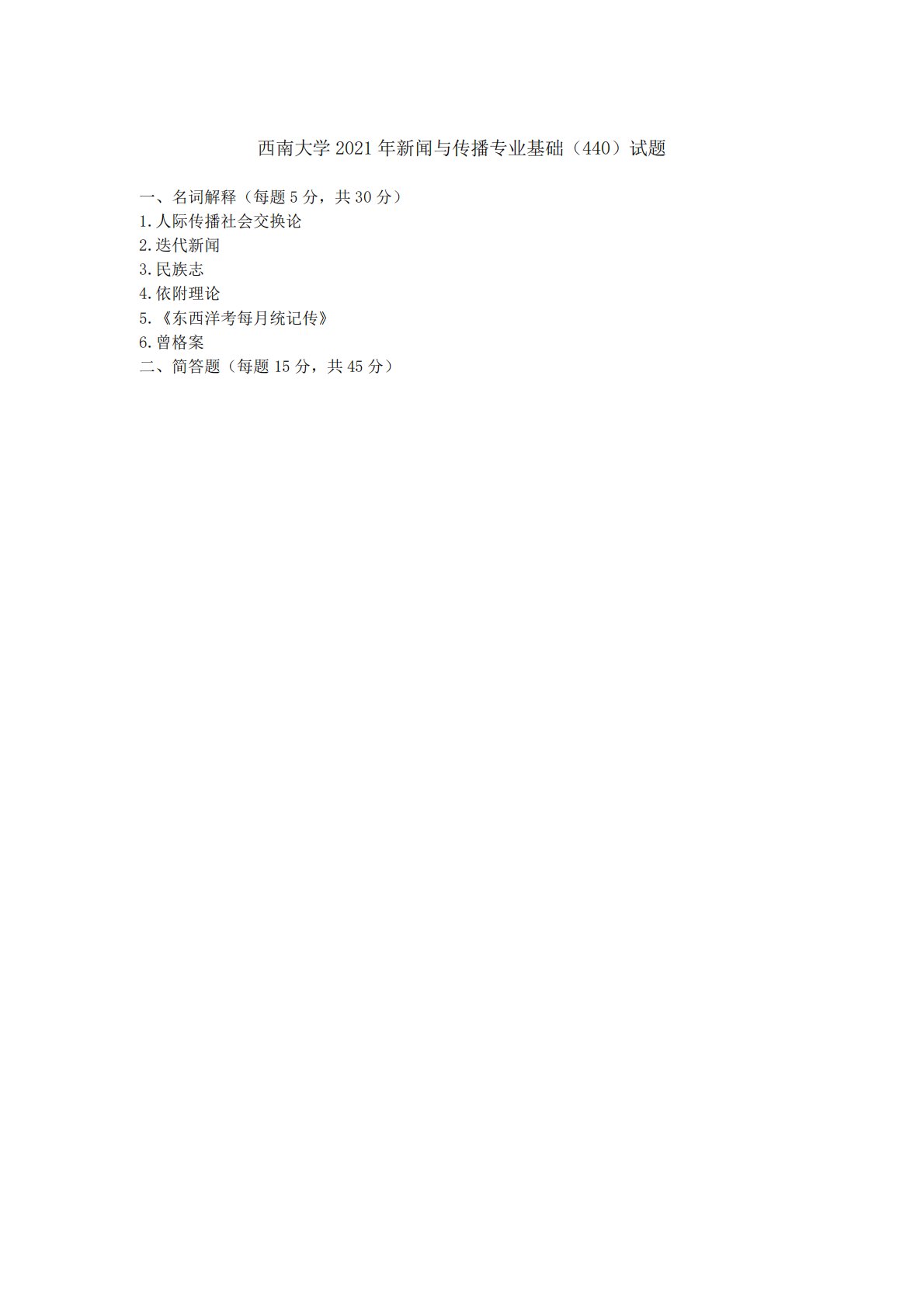 西南大学2021年新闻与传播专业基础(440)试题一、名词解释(每题5分,共30分)1.人际传播社会交换论2.迭代新闻3.民族志4.依附理论5.《东西洋考每月统记传》6.曾格案二、简答题(每题15分,共45分)西南大学2021年新闻与传播专业基础(440)试题一、名词解释(每题5分,共30分)1.人际传播社会交换论2.迭代新闻3.民族志4.依附理论5.《东西洋考每月统记传》6.曾格案二、简答题(每题15分,共45分)1.简述算法新闻的内涵以及影响。2.简述传播效果研究中文化效果的具体内容。3.简述国人第一次办报高潮中维新派报刊的情况以及贡献。三、消息改写(共25分)材料是《区域全面经济伙伴关系...