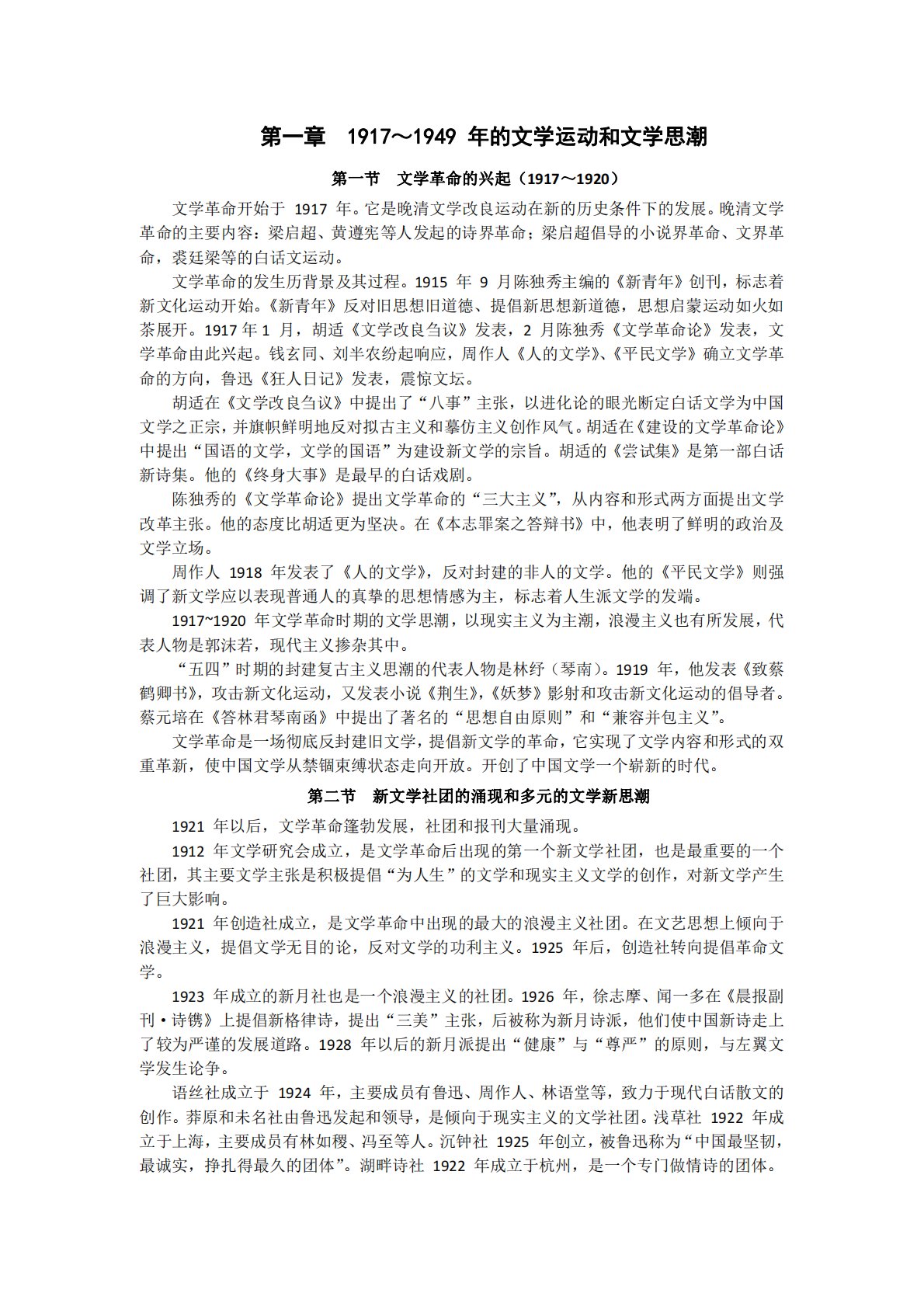第一章1917~1949年的文学运动和文学思潮第一节文学革命的兴起(1917~1920)文学革命开始于1917年。它是晚清文学改良运动在新的历史条件下的发展。晚清文学革命的主要内容:梁启超、黄遵宪等人发起的诗界革命;梁启超倡导的小说界革命、文界革命,裘廷梁等的白话文运动。文学革命的发生历背景及其过程。1915年9月陈独秀主编的《新青年》创刊,标志着新文化运动开始。《新青年》反对旧思想旧道德、提倡新思想新道德,思想启蒙运动如火如茶展开。1917年1月,胡适《文学改良刍议》发表,2月陈独秀《文学革命论》发表,文学革命由此兴起。钱玄同、刘半农纷起响应,周作人《人的文学》、《平民文学》确立文学革命的方...