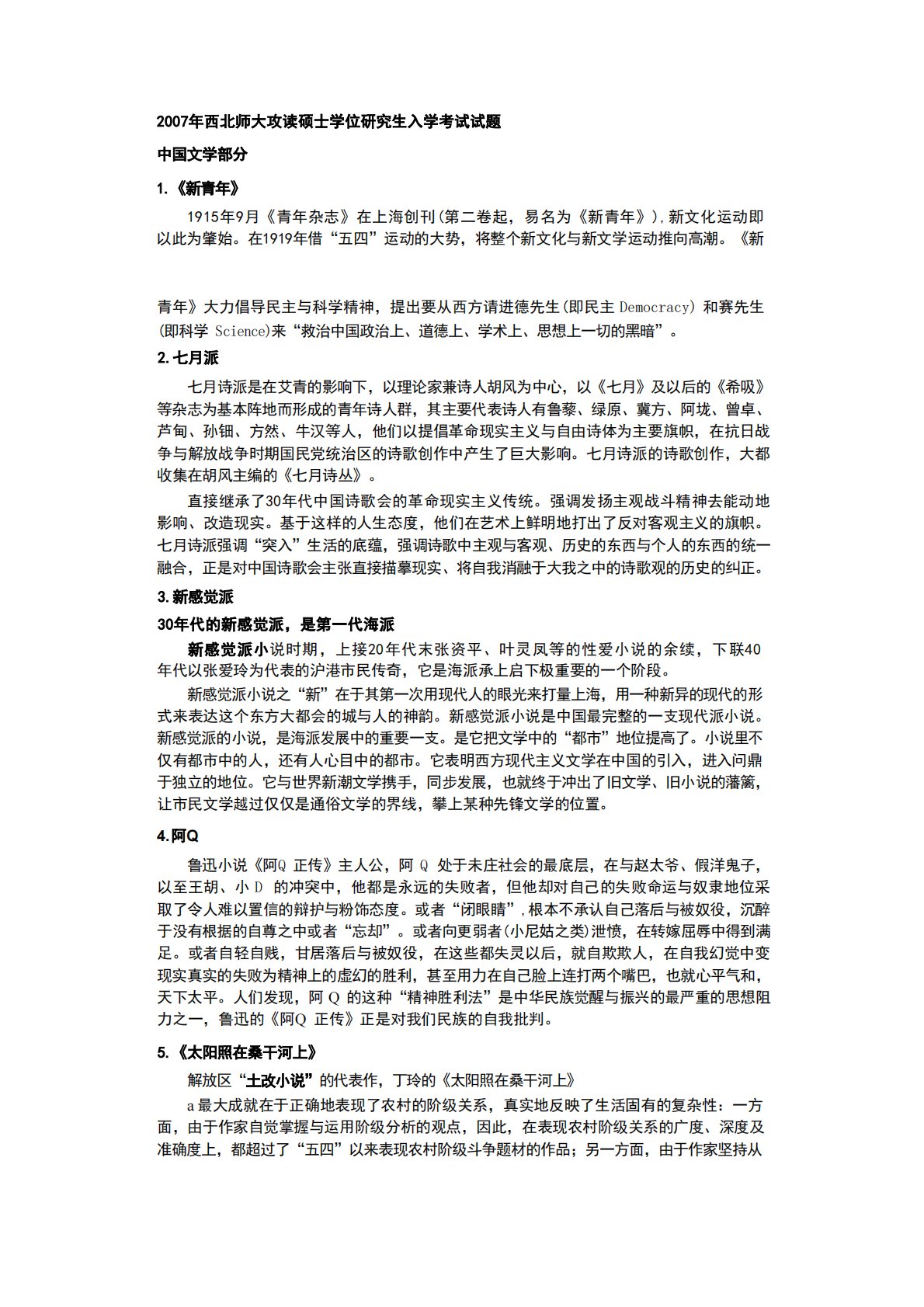2007年西北师大攻读硕士学位研究生入学考试试题中国文学部分1.《新青年》1915年9月《青年杂志》在上海创刊(第二卷起,易名为《新青年》),新文化运动即以此为肇始。在1919年借“五四”运动的大势,将整个新文化与新文学运动推向高潮。《新青年》大力倡导民主与科学精神,提出要从西方请进德先生(即民主Democracy)和赛先生(即科学Science)来“救治中国政治上、道德上、学术上、思想上一切的黑暗”。2.七月派七月诗派是在艾青的影响下,以理论家兼诗人胡风为中心,以《七月》及以后的《希吸》等杂志为基本阵地而形成的青年诗人群,其主要代表诗人有鲁藜、绿原、冀方、阿垅、曾卓、芦甸、孙钿、方然、牛汉等...