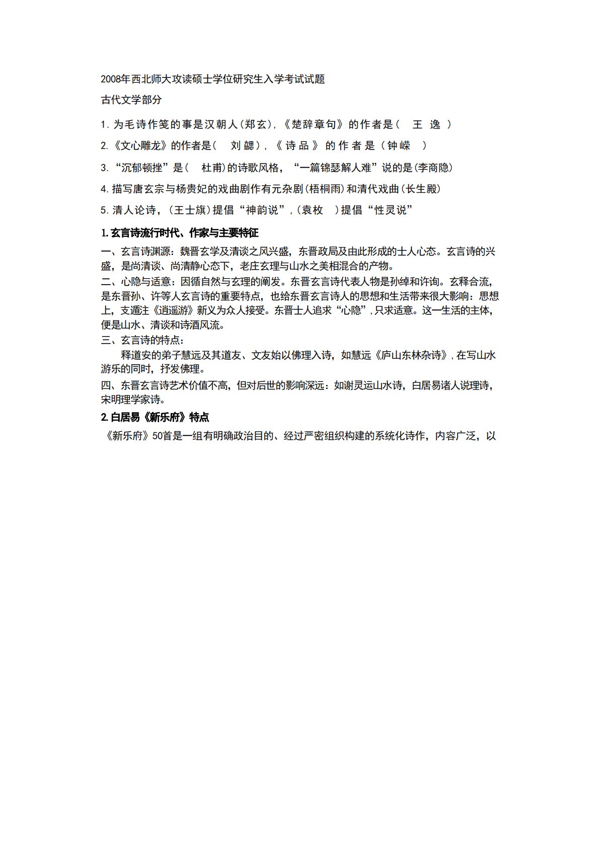 2008年西北师大攻读硕士学位研究生入学考试试题古代文学部分1.为毛诗作笺的事是汉朝人(郑玄),《楚辞章句》的作者是(王逸)2.《文心雕龙》的作者是(刘勰),《诗品》的作者是(钟嵘)3.“沉郁顿挫”是(杜甫)的诗歌风格,“一篇锦瑟解人难”说的是(李商隐)4.描写唐玄宗与杨贵妃的戏曲剧作有元杂剧(梧桐雨)和清代戏曲(长生殿)5.清人论诗,(王士旗)提倡“神韵说”,(袁枚)提倡“性灵说”1.玄言诗流行时代、作家与主要特征一、玄言诗渊源:魏晋玄学及清谈之风兴盛,东晋政局及由此形成的士人心态。玄言诗的兴盛,是尚清谈、尚清静心态下,老庄玄理与山水之美相混合的产物。二、心隐与适意:因循自然与玄理的阐发。东...