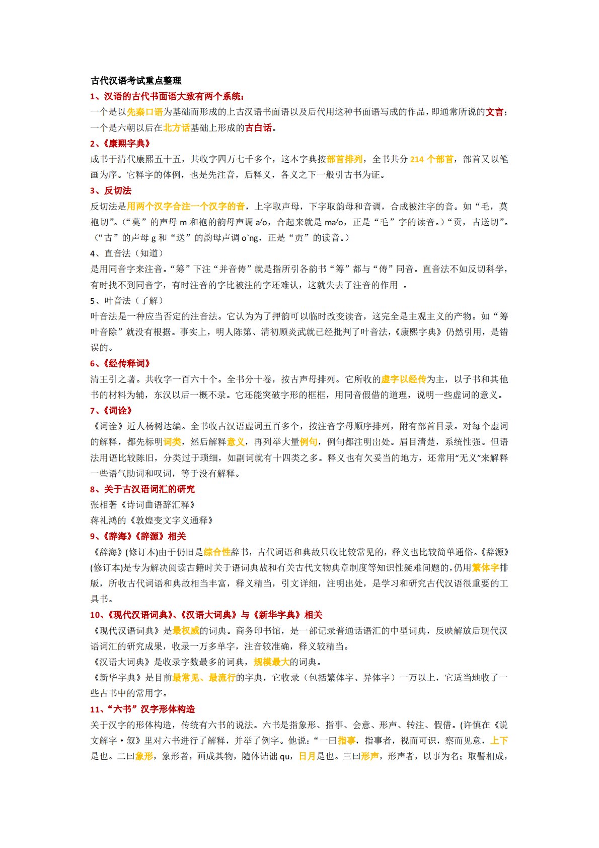 古代汉语考试重点整理1、汉语的古代书面语大致有两个系统:一个是以先秦口语为基础而形成的上古汉语书面语以及后代用这种书面语写成的作品,即通常所说的文言;一个是六朝以后在北方话基础上形成的古白话。2、《康熙字典》成书于清代康熙五十五,共收字四万七千多个,这本字典按部首排列,全书共分214个部首,部首又以笔画为序。它释字的体例,也是先注音,后释义,各义之下一般引古书为证。3、反切法反切法是用两个汉字合注一个汉字的音,上字取声母,下字取韵母和音调,合成被注字的音。如“毛,莫袍切”。(“莫”的声母m和袍的韵母声调a/o,合起来就是ma/o,正是“毛”字的读音。)“贡,古送切”。(“古”的声母g和“送”的...