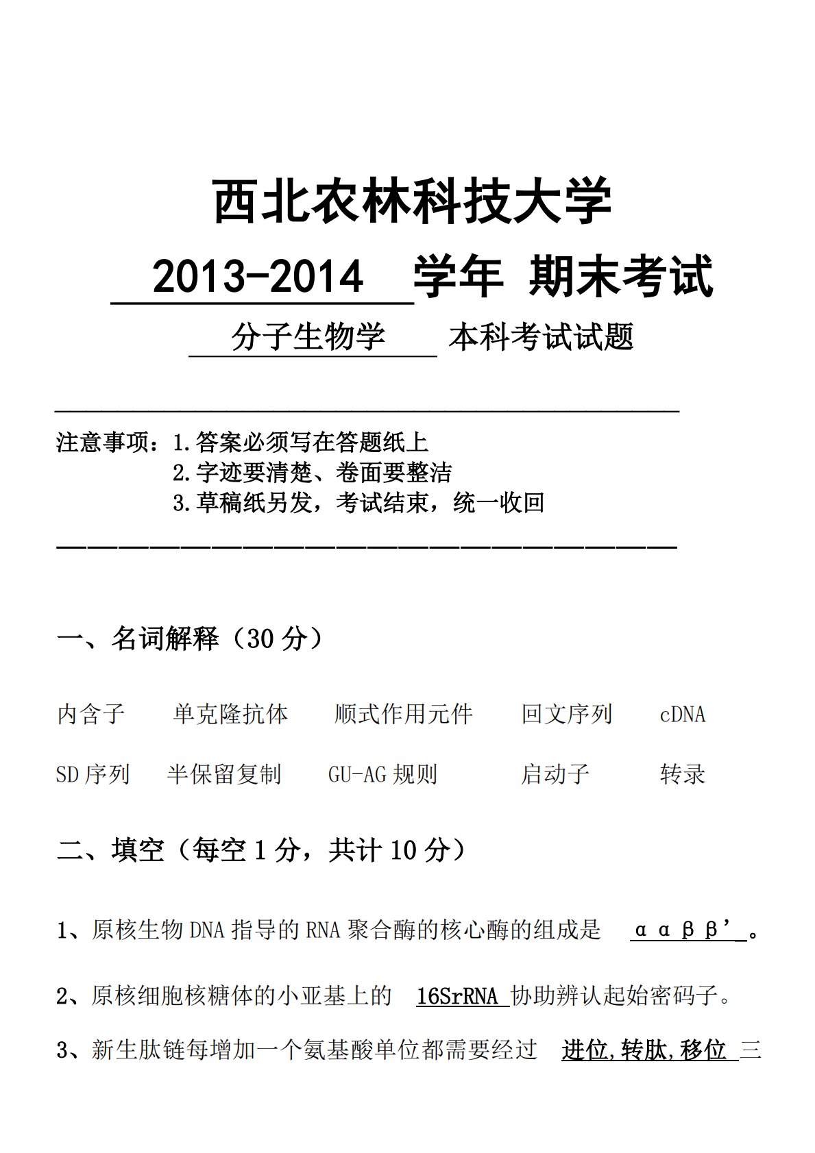 西北农林科技大学2013-2014学年期末考试分子生物学本科考试试题________________________________________注意事项:1.答案必须写在答题纸上2.字迹要清楚、卷面要整洁3.草稿纸另发,考试结束,统一收回————————————————————一、名词解释(30分)内含子SD序列单克隆抗体半保留复制顺式作用元件GU-AG规则回文序列启动子cDNA转录二、填空(每空1分,共计10分)1、原核生物DNA指导的RNA聚合酶的核心酶的组成是ααββ'_。2、原核细胞核糖体的小亚基上的16SrRNA协助辨认起始密码子。3、新生肽链每增加一个氨基酸单位都需要经过进位,...
