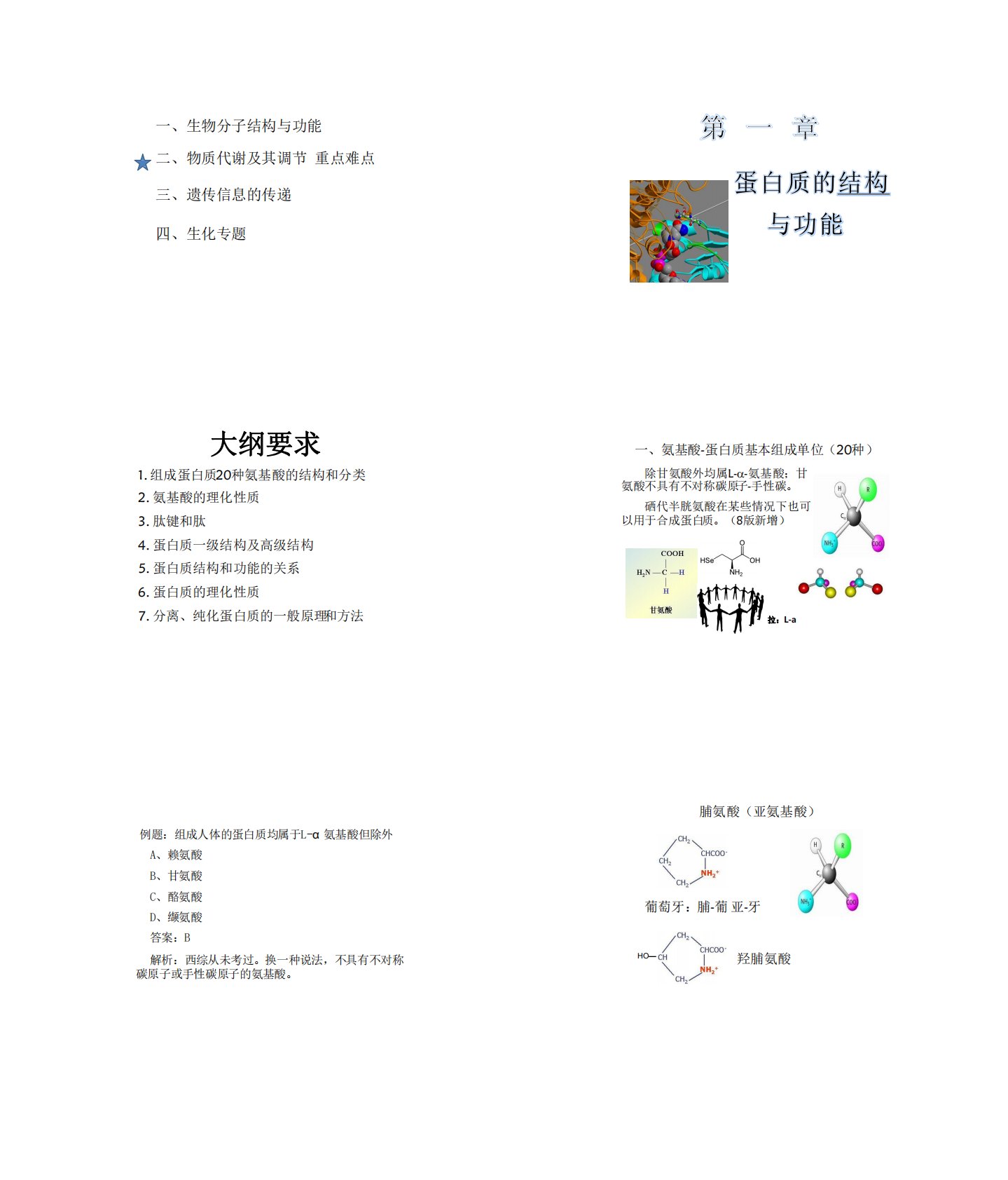 一、生物分子结构与功能二、物质代谢及其调节重点难点三、遗传信息的传递四、生化专题1.组成蛋白质20种氨基酸的结构和分类2.氨基酸的理化性质3.肽键和肽4.蛋白质一级结构及高级结构5.蛋白质结构和功能的关系6.蛋白质的理化性质7.分离、纯化蛋白质的一般原理和方法大纲要求一、氨基酸-蛋白质基本组成单位(20种)除甘氨酸外均属L--氨基酸;甘氨酸不具有不对称碳原子-手性碳。硒代半胱氨酸在某些情况下也可以用于合成蛋白质。(8版新增)拉:L-a例题:组成人体的蛋白质均属于L-α氨基酸但除外A、赖氨酸B、甘氨酸C、酪氨酸D、缬氨酸答案:B解析:西综从未考过。换一种说法,不具有不对称碳原子或手性碳原子的氨...