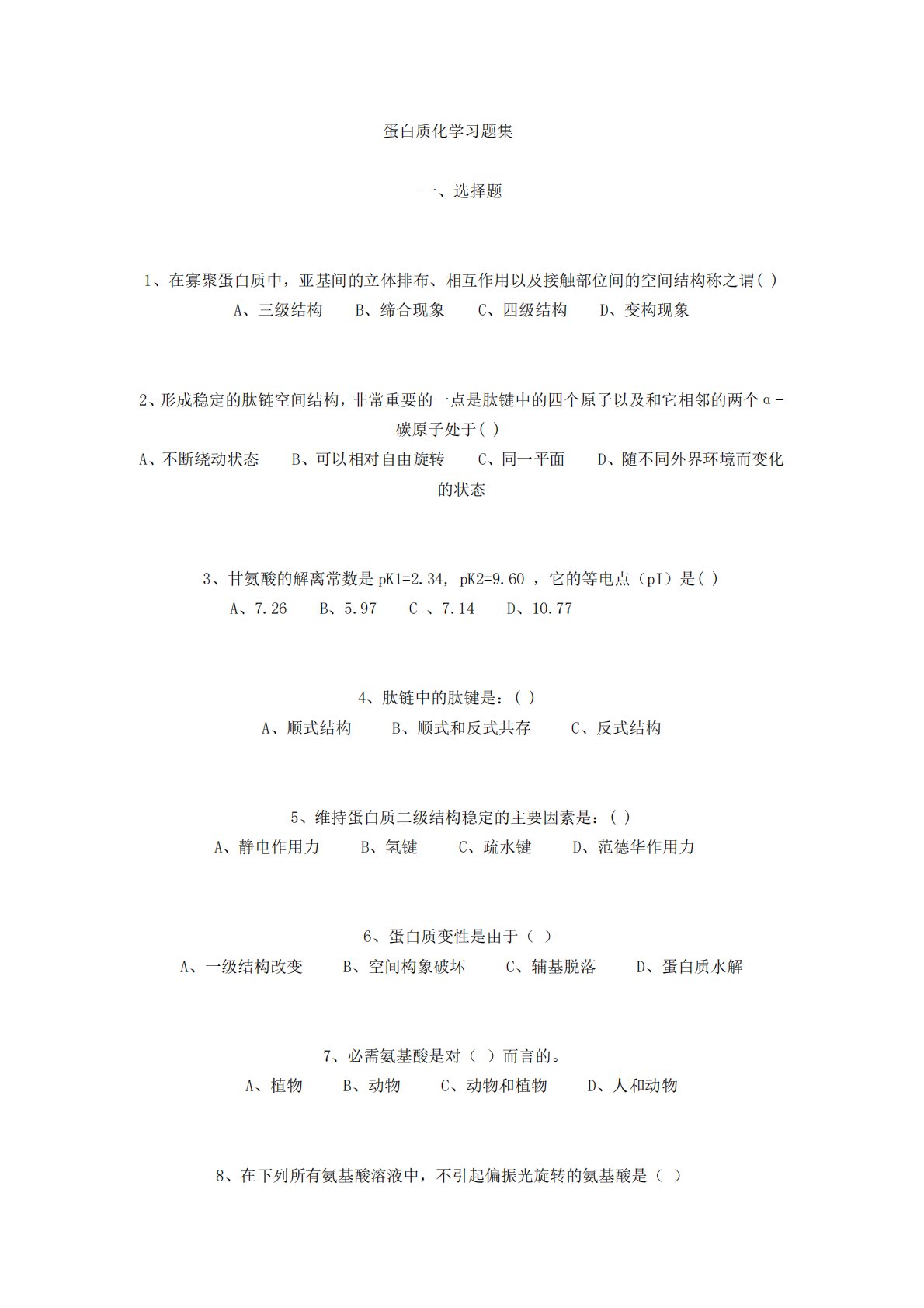 蛋白质化学习题集bbs.5432.net*^.G*@/[5x.c/H-\6_7t*q6^*Y3Q4~.K#i一、选择题5432考研论坛+V3K0T;s-l)g(N5432考研论坛(M:O#^"_%C1、在寡聚蛋白质中,亚基间的立体排布、相互作用以及接触部位间的空间结构称之谓()A、三级结构B、缔合现象C、四级结构D、变构现象考研,考研论坛,F0f"c!f6K.k)H;R0\2、形成稳定的肽链空间结构,非常重要的一点是肽键中的四个原子以及和它相邻的两个α-碳原子处于()bbs.5432.net)G6}+k4OD(j.XA、不断绕动状态B、可以相对自由旋转C、同一平面D、随不同外界环境而变化的状态...