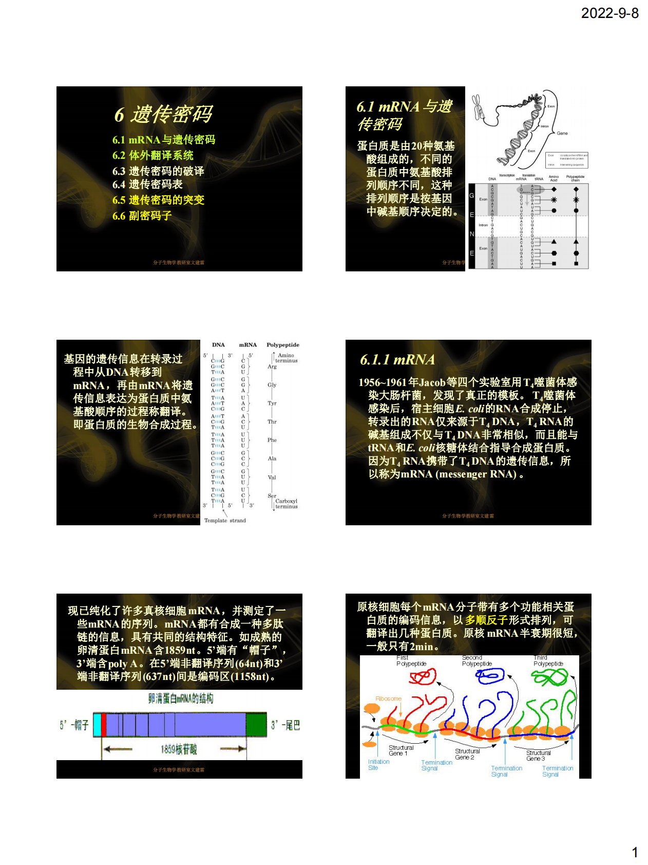 2022-9-81分子生物学教研室文建雷6遗传密码6.1mRNA与遗传密码6.2体外翻译系统6.3遗传密码的破译6.4遗传密码表6.5遗传密码的突变6.6副密码子分子生物学教研室文建雷6.1mRNA与遗传密码蛋白质是由20种氨基酸组成的,不同的蛋白质中氨基酸排列顺序不同,这种排列顺序是按基因中碱基顺序决定的。分子生物学教研室文建雷基因的遗传信息在转录过程中从DNA转移到mRNA,再由mRNA将遗传信息表达为蛋白质中氨基酸顺序的过程称翻译。即蛋白质的生物合成过程。分子生物学教研室文建雷6.1.1mRNA1956~1961年Jacob等四个实验室用T4噬菌体感染大肠杆菌,发现了真正的模板。T4噬菌...