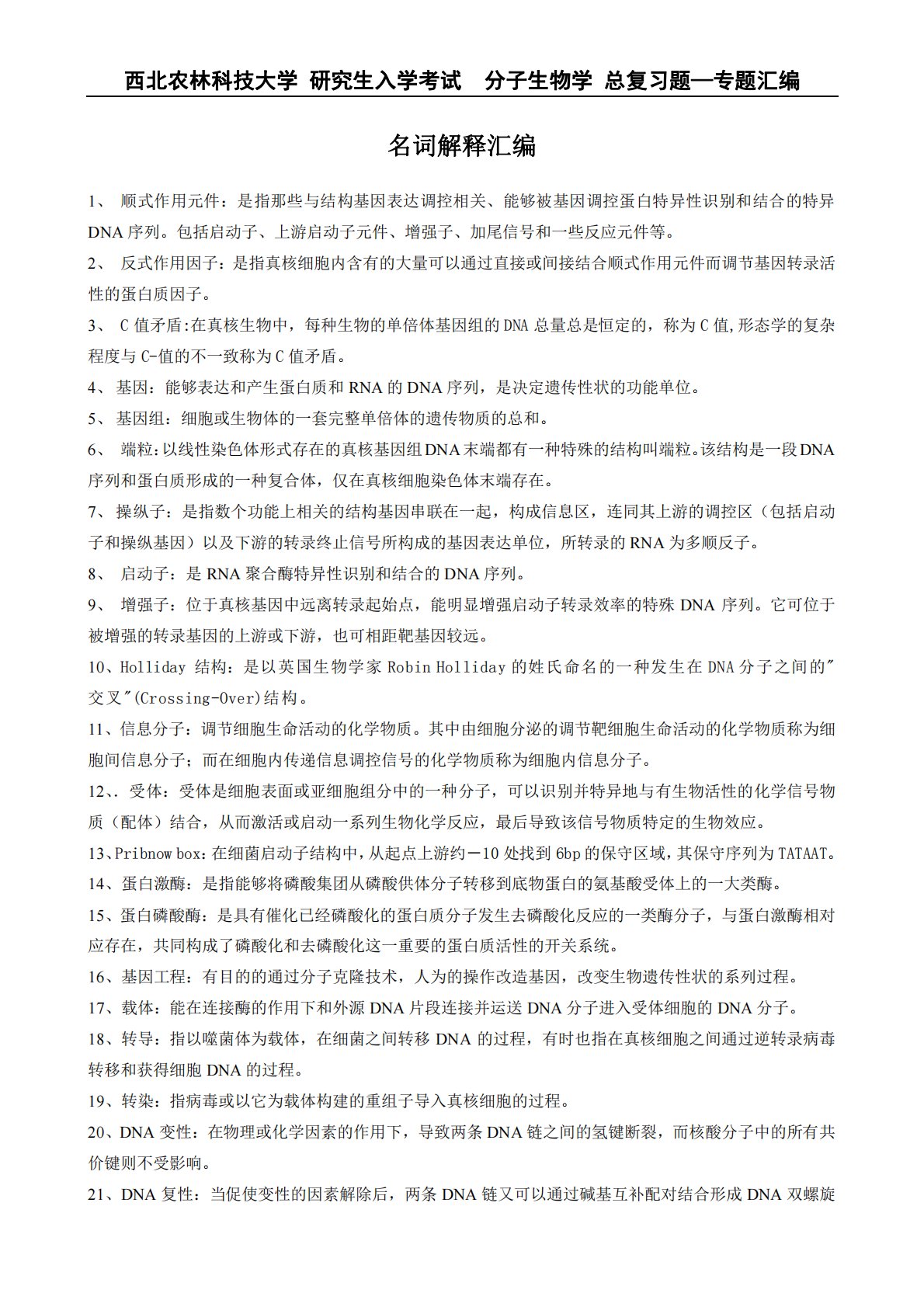 西北农林科技大学研究生入学考试分子生物学总复习题—专题汇编 名词解释汇编1、顺式作用元件:是指那些与结构基因表达调控相关、能够被基因调控蛋白特异性识别和结合的特异DNA序列。包括启动子、上游启动子元件、增强子、加尾信号和一些反应元件等。2、反式作用因子:是指真核细胞内含有的大量可以通过直接或间接结合顺式作用元件而调节基因转录活性的蛋白质因子。3、C值矛盾:在真核生物中,每种生物的单倍体基因组的DNA总量总是恒定的,称为C值,形态学的复杂程度与C-值的不一致称为C值矛盾。4、基因:能够表达和产生蛋白质和RNA的DNA序列,是决定遗传性状的功能单位。5、基因组:细胞或生物体的一套完整单倍体的遗传物...