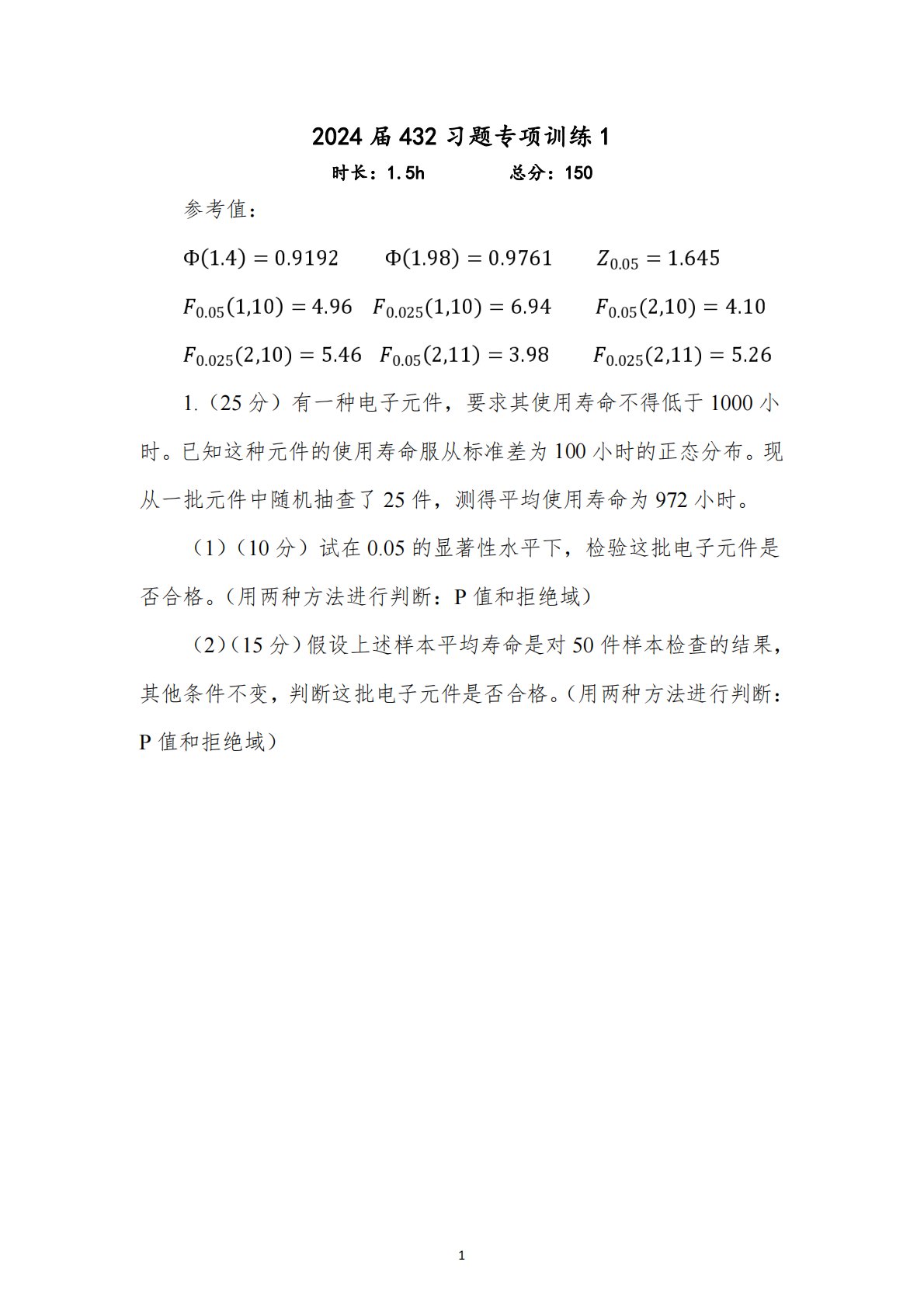 12024届432习题专项训练1时长:1.5h总分:150参考值:1.(25分)有一种电子元件,要求其使用寿命不得低于1000小时。已知这种元件的使用寿命服从标准差为100小时的正态分布。现从一批元件中随机抽查了25件,测得平均使用寿命为972小时。(1)(10分)试在0.05的显著性水平下,检验这批电子元件是否合格。(用两种方法进行判断:P值和拒绝域)(2)(15分)假设上述样本平均寿命是对50件样本检查的结果,其他条件不变,判断这批电子元件是否合格。(用两种方法进行判断:P值和拒绝域)22.(25分)总体~−1,+1,1、2、……是来自总体的一个简单随机样本,证明和12...