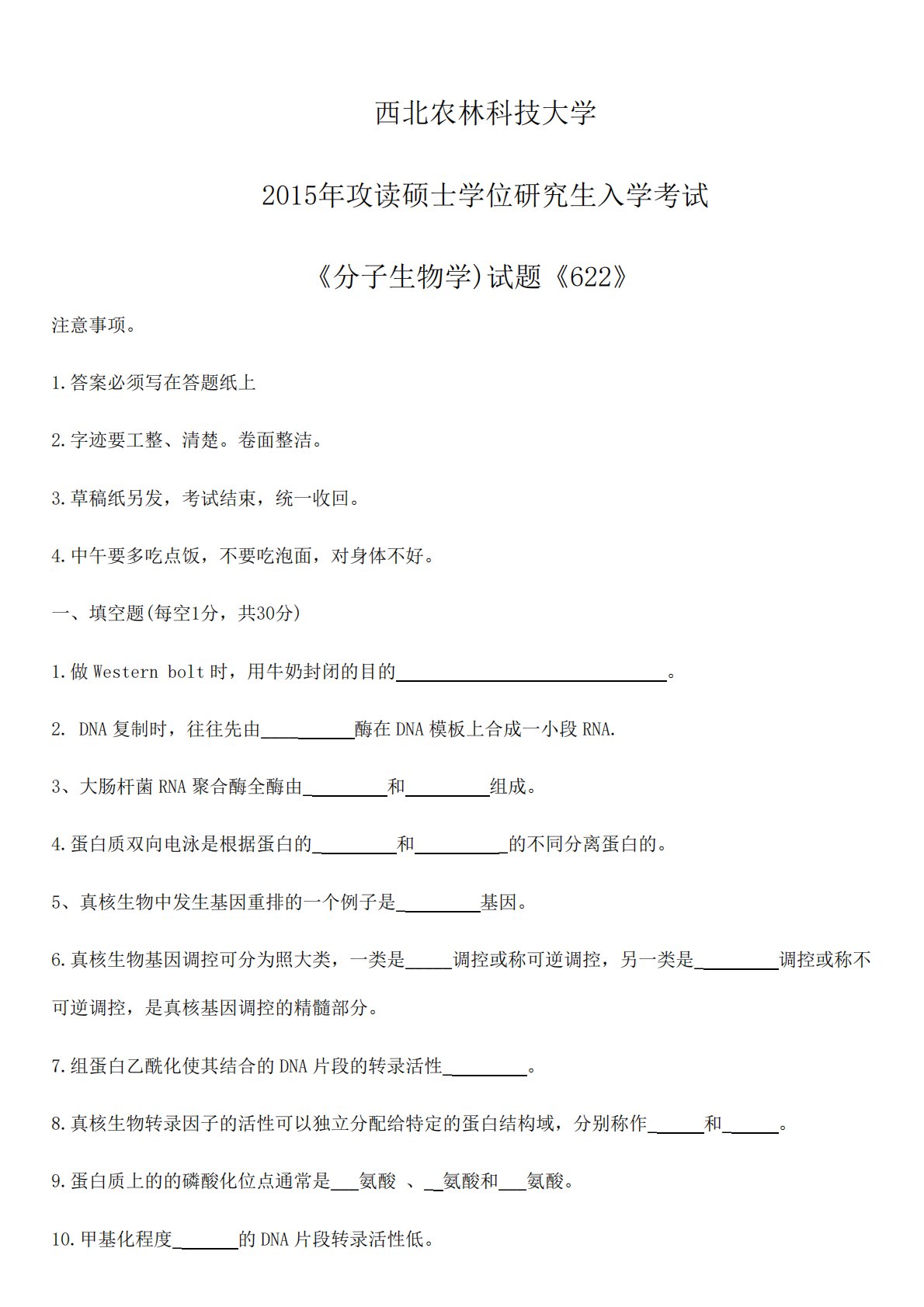 注意事项。1.答案必须写在答题纸上2.字迹要工整、清楚。卷面整洁。3.草稿纸另发,考试结束,统一收回。4.中午要多吃点饭,不要吃泡面,对身体不好。一、填空题(每空1分,共30分)1.做Westernbolt西北农林科技大学2015年攻读硕士学位研究生入学考试《分子生物学)试题《622》时,用牛奶封闭的目的。2.DNA复制时,往往先由____酶在DNA模板上合成一小段RNA.3、大肠杆菌RNA聚合酶全酶由_和组成。4.蛋白质双向电泳是根据蛋白的_和_的不同分离蛋白的。5、真核生物中发生基因重排的一个例子是_基因。6.真核生物基因调控可分为照大类,一类是_____调控或称可逆调控,另一类是_调控或...