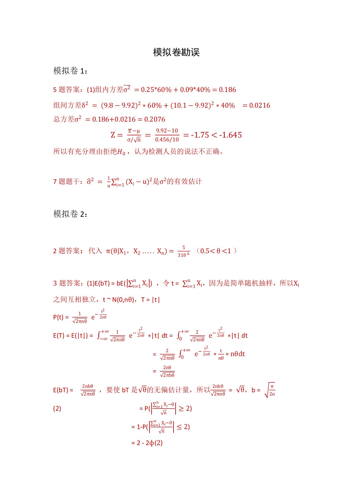 模拟卷勘误模拟卷1:5题答案:(1)组内方差σ2=0.25*60%+0.09*40%=0.186组间方差δ2=(9.8−9.92)2∗60%+(10.1−9.92)2∗40%=0.0216总方差σ2=0.186+0.0216=0.2076Z=x−µσ/n=9.92−100.456/10=-1.75<-1.645所以有充分理由拒绝0,认为检测人员的说法不正确。7题题干:σ2=1ni=1n(Xi−u)2是σ2的有效估计模拟卷2:2题答案:代入π(θ|X1,X2.....Xn)=531θ6(0.5<θ