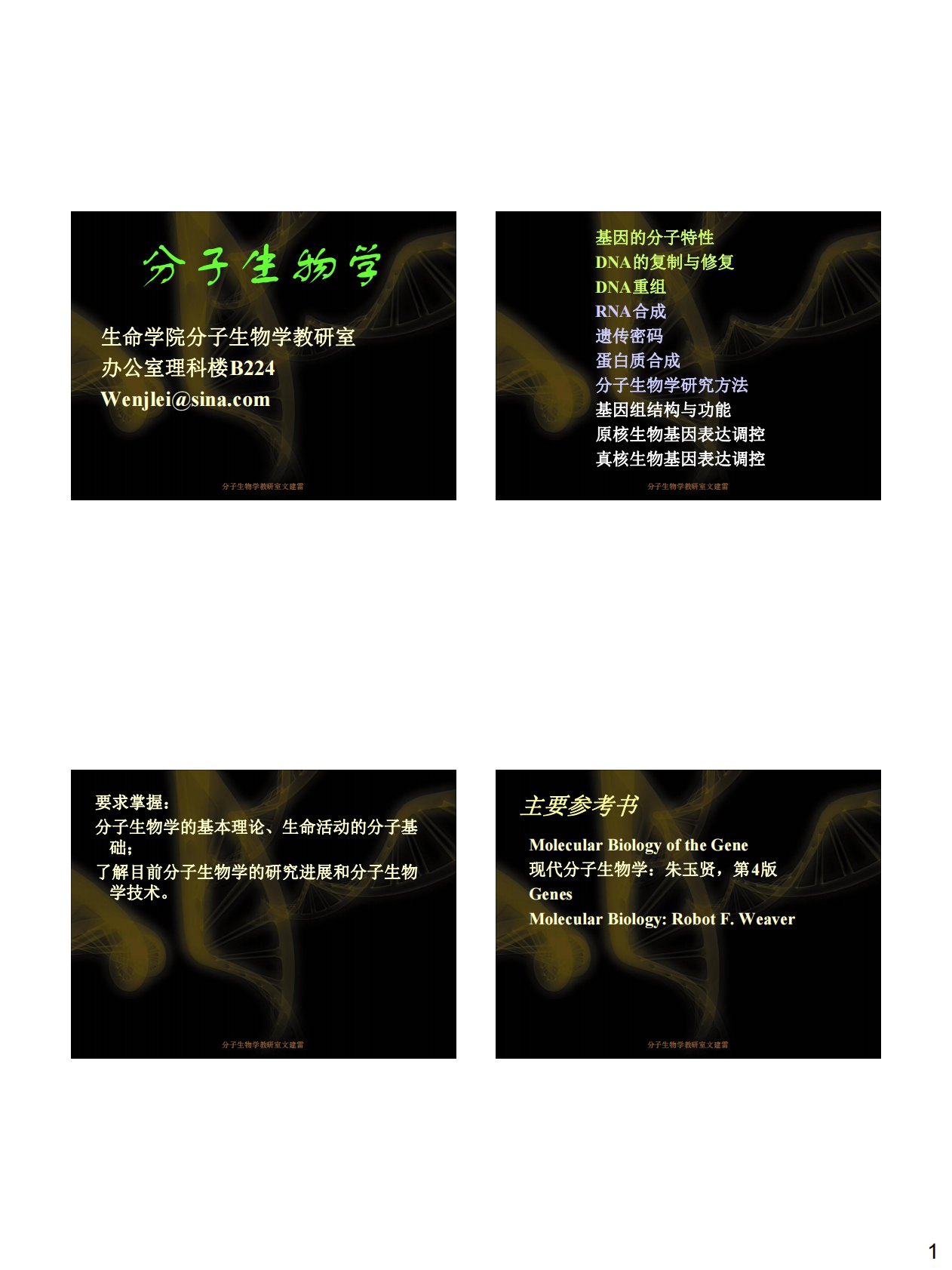 1分子生物学教研室文建雷分子生物学生命学院分子生物学教研室办公室理科楼B224Wenjlei@sina.com分子生物学教研室文建雷基因的分子特性DNA的复制与修复DNA重组RNA合成遗传密码蛋白质合成分子生物学研究方法基因组结构与功能原核生物基因表达调控真核生物基因表达调控分子生物学教研室文建雷要求掌握:分子生物学的基本理论、生命活动的分子基础;了解目前分子生物学的研究进展和分子生物学技术。分子生物学教研室文建雷主要参考书MolecularBiologyoftheGene现代分子生物学:朱玉贤,第4版GenesMolecularBiology:RobotF.Weaver分子生物学教研室文建雷...