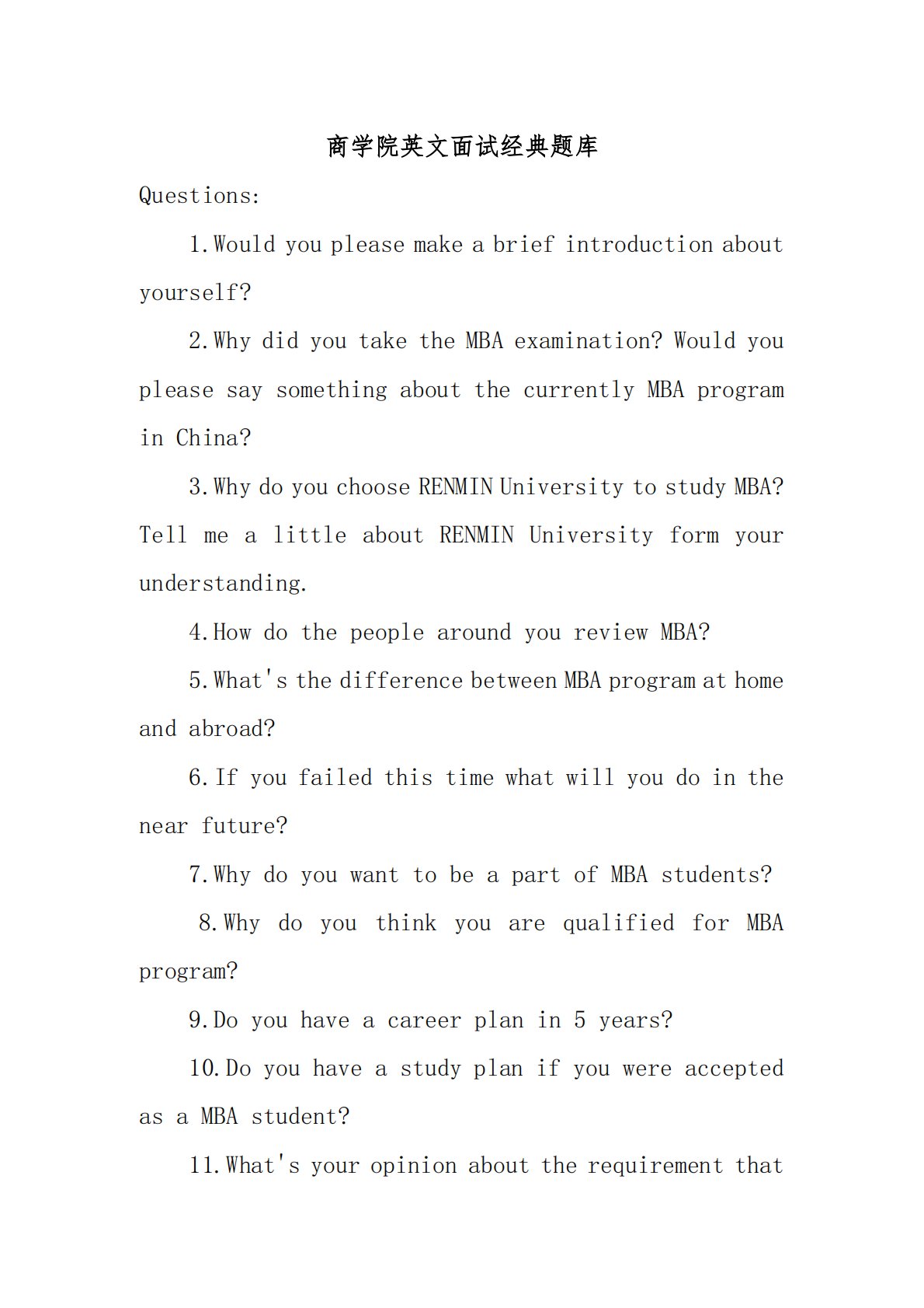 商学院英文面试经典题库Questions:1.Wouldyoupleasemakeabriefintroductionaboutyourself?3.WhydoyouchooseRENMINUniversitytostudyMBA?TellmealittleaboutRENMINUniversityformyourunderstanding.4.HowdothepeoplearoundyoureviewMBA?5.What'sthedifferencebetweenMBAprogramathomeandabroad?6.Ifyoufailedthistimewhatwillyoudointhe...