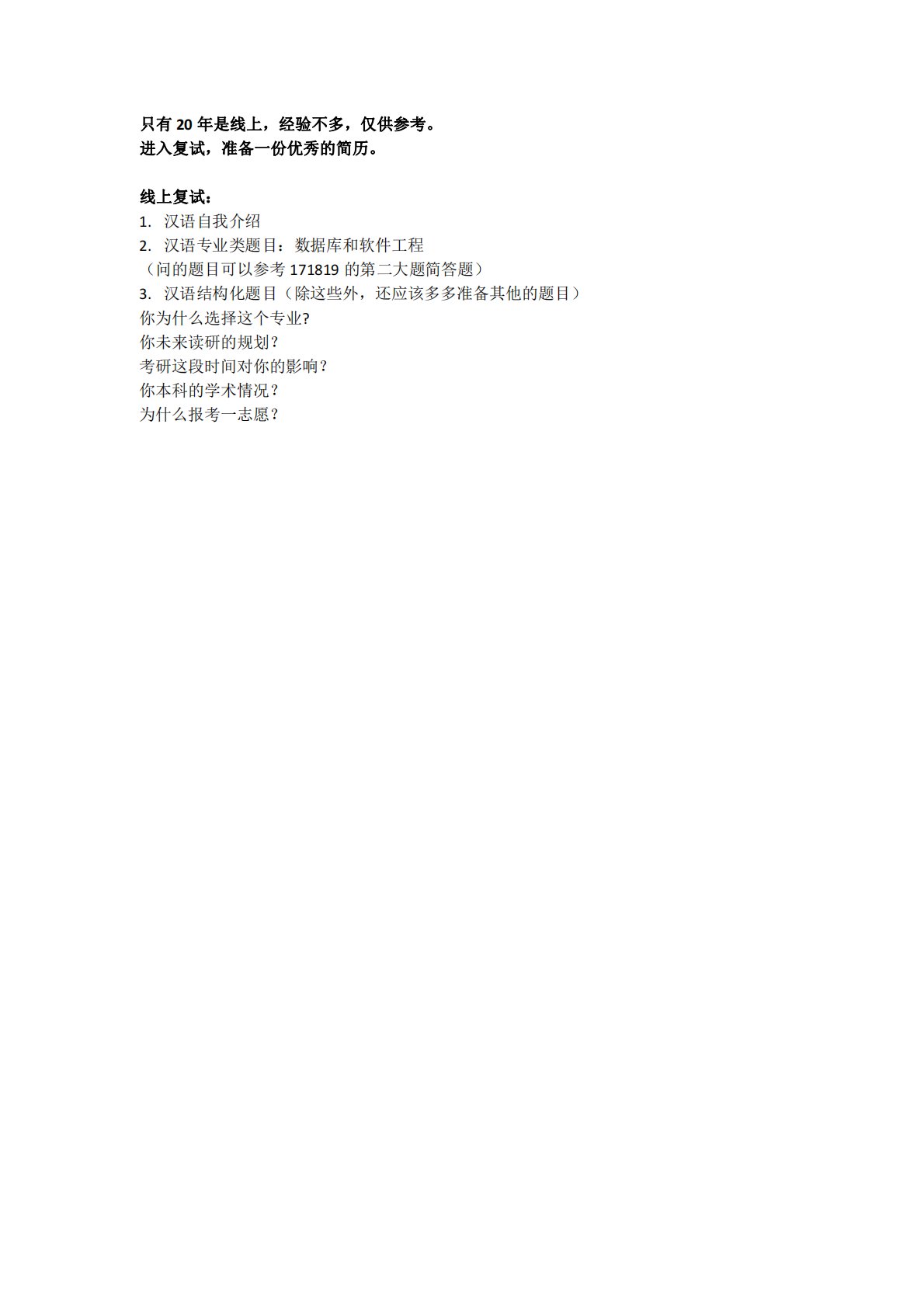 只有20年是线上,经验不多,仅供参考。进入复试,准备一份优秀的简历。线上复试:1.汉语自我介绍2.汉语专业类题目:数据库和软件工程(问的题目可以参考171819的第二大题简答题)3.汉语结构化题目(除这些外,还应该多多准备其他的题目)你为什么选择这个专业?你未来读研的规划?考研这段时间对你的影响?你本科的学术情况?为什么报考一志愿?只有20年是线上,经验不多,仅供参考。进入复试,准备一份优秀的简历。线上复试:1.汉语自我介绍2.汉语专业类题目:数据库和软件工程(问的题目可以参考171819的第二大题简答题)3.汉语结构化题目(除这些外,还应该多多准备其他的题目)你为什么选择这个专业?你未来读研...