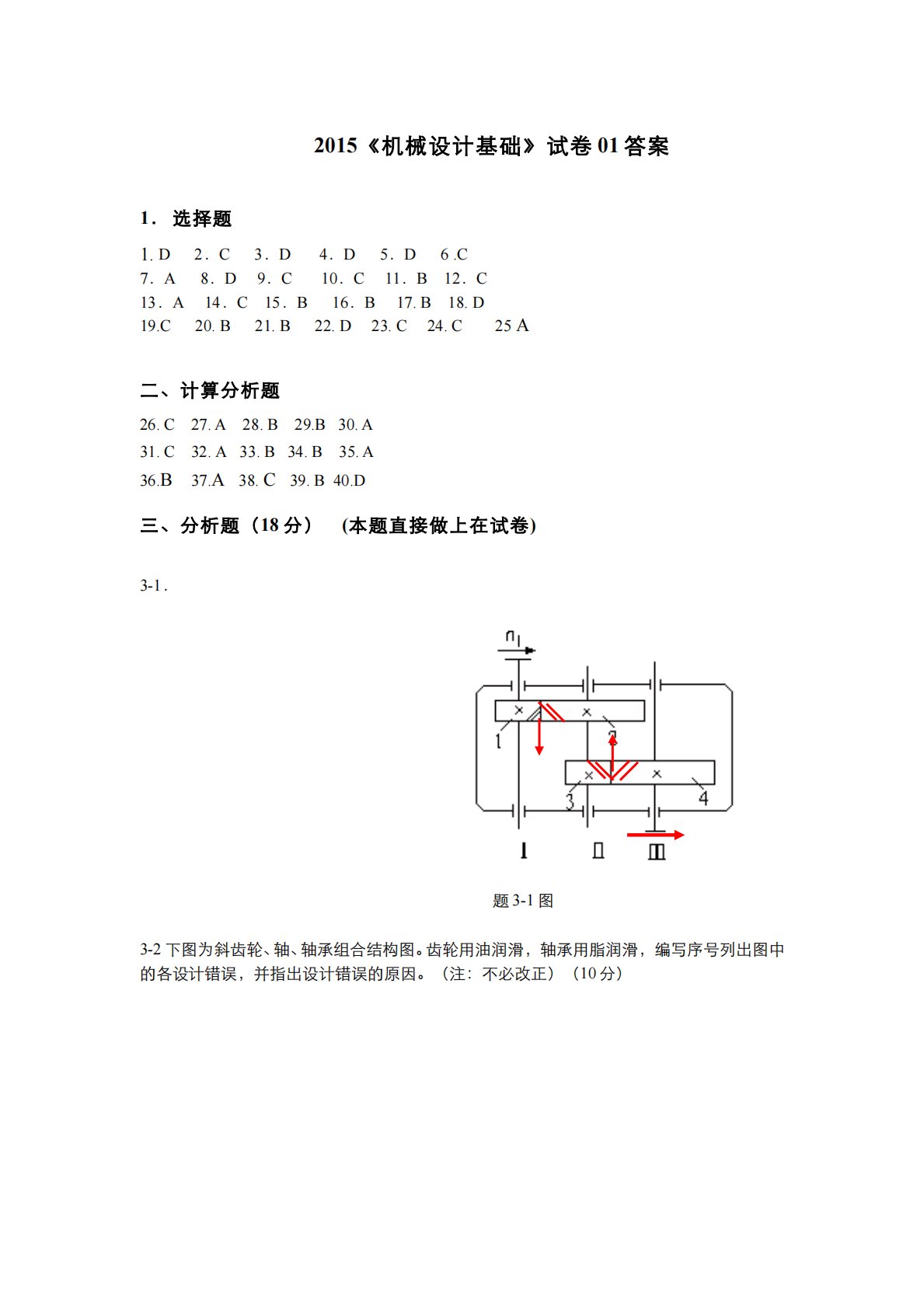 2015《机械设计基础》试卷01答案1.选择题1.D2.C3.D4.D5.D6.C7.A8.D9.C10.C11.B12.C13.A14.C15.B16.B17.B18.D19.C20.B21.B22.D23.C24.C25A二、计算分析题26.C27.A28.B29.B30.A31.C32.A33.B34.B35.A36.B37.A38.C39.B40.D三、分析题(18分)(本题直接做上在试卷)3-1.题3-1图3-2下图为斜齿轮、轴、轴承组合结构图。齿轮用油润滑,轴承用脂润滑,编写序号列出图中的各设计错误,并指出设计错误的原因。(注:不必改正)(10分)题3-2图(1)不应有密封装置;(...