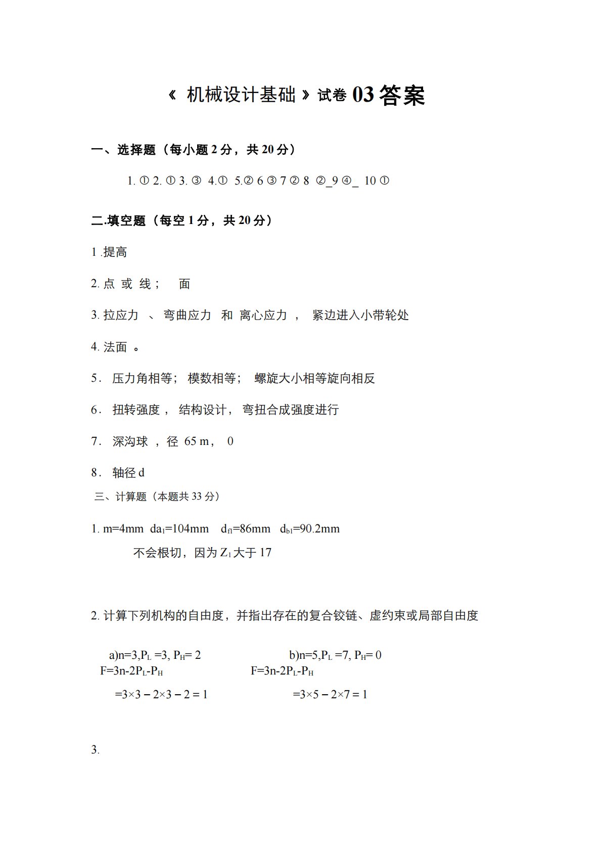 《机械设计基础》试卷03答案一、选择题(每小题2分,共20分)1.①2.①3.③4.①5.②6③7②8②_9④_10①二.填空题(每空1分,共20分)1.提高2.点或线;面3.拉应力、弯曲应力和离心应力,紧边进入小带轮处4.法面。5.压力角相等;模数相等;螺旋大小相等旋向相反6.扭转强度,结构设计,弯扭合成强度进行7.深沟球,径65m,08.轴径d三、计算题(本题共33分)1.m=4mmda1=104mmdf1=86mmdb1=90.2mm不会根切,因为Z1大于172.计算下列机构的自由度,并指出存在的复合铰链、虚约束或局部自由度a)n=3,PL=3,PH=2b)n=5,PL=7,PH=0F=...