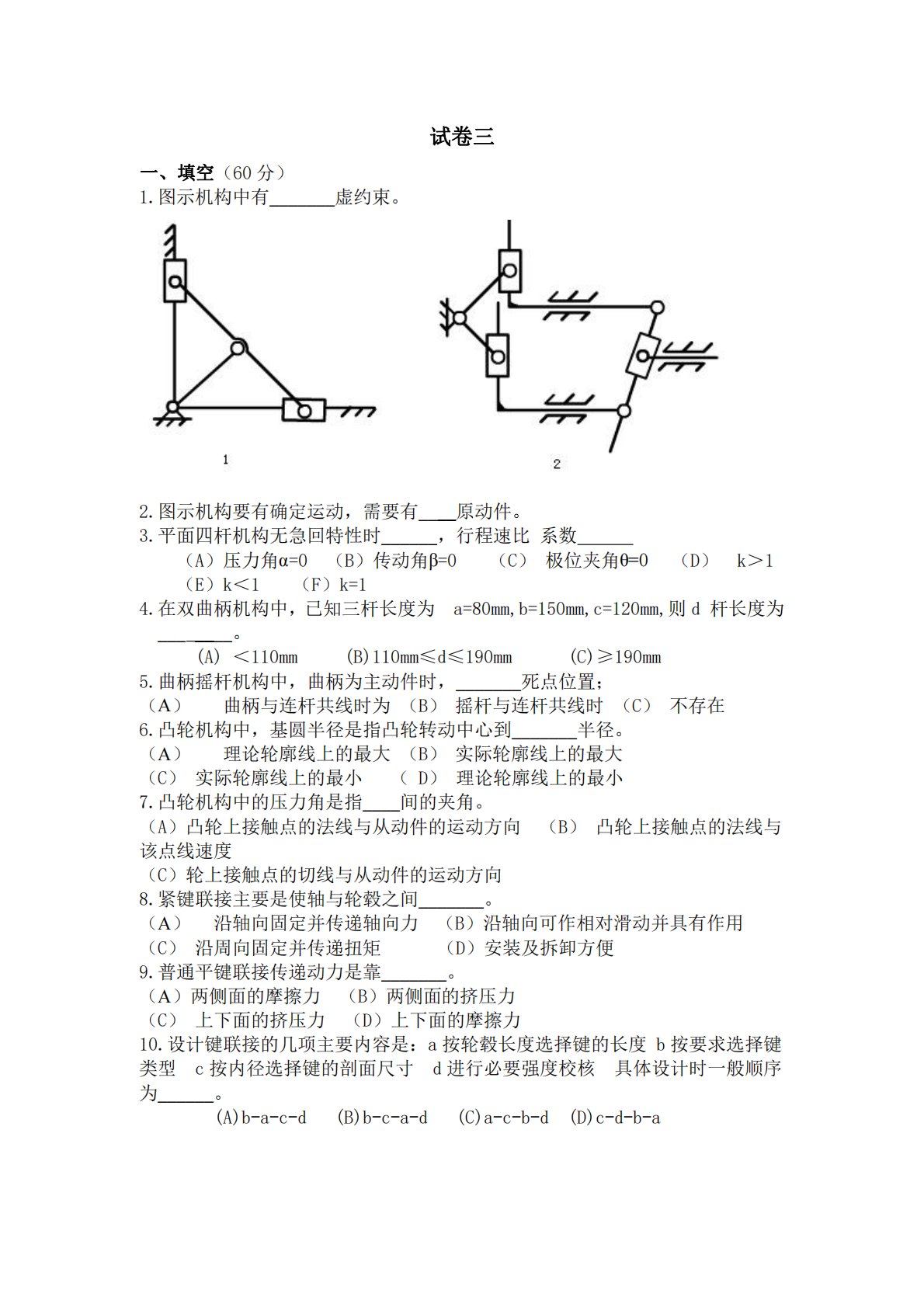 试卷三一、填空(60分)1.图示机构中有_______虚约束。2.图示机构要有确定运动,需要有____原动件。3.平面四杆机构无急回特性时______,行程速比系数(A)压力角α=0(B)传动角β=0(C)极位夹角θ=0(D)k>1(E)k<1(F)k=14.在双曲柄机构中,已知三杆长度为a=80mm,b=150mm,c=120mm,则d杆长度为_______。(A)<110mm(B)110mm≤d≤190mm(C)≥190mm5.曲柄摇杆机构中,曲柄为主动件时,_______死点位置;(A)曲柄与连杆共线时为(B)摇杆与连杆共线时(C)不存在6.凸轮机构中,基圆半径是指凸轮转动中心到____...