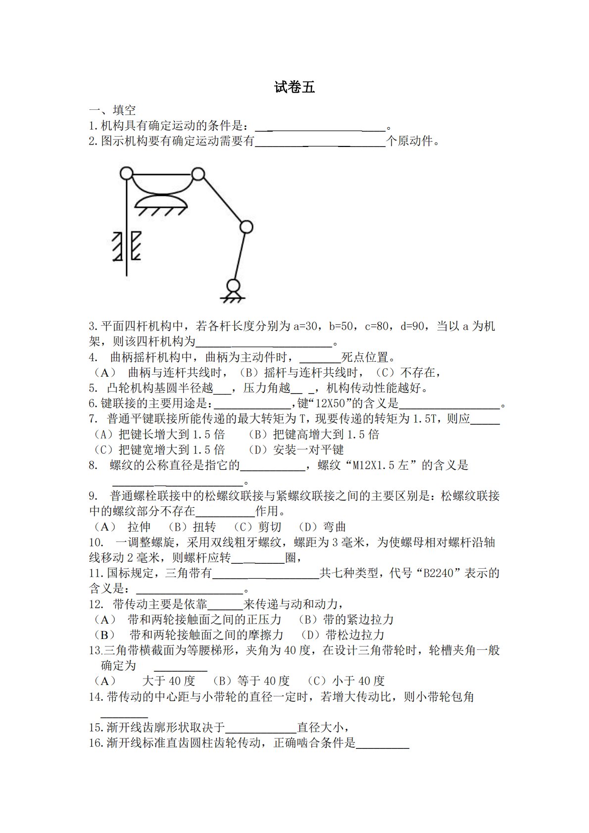 试卷五一、填空1.机构具有确定运动的条件是:_______。2.图示机构要有确定运动需要有_________________个原动件。3.平面四杆机构中,若各杆长度分别为a=30,b=50,c=80,d=90,当以a为机架,则该四杆机构为________________。4.曲柄摇杆机构中,曲柄为主动件时,_______死点位置。(A)曲柄与连杆共线时,(B)摇杆与连杆共线时,(C)不存在,5.凸轮机构基圆半径越___,压力角越___,机构传动性能越好。6.键联接的主要用途是:_____________,键“12X50”的含义是_________________。7.普通平键联接所能传递的最大...