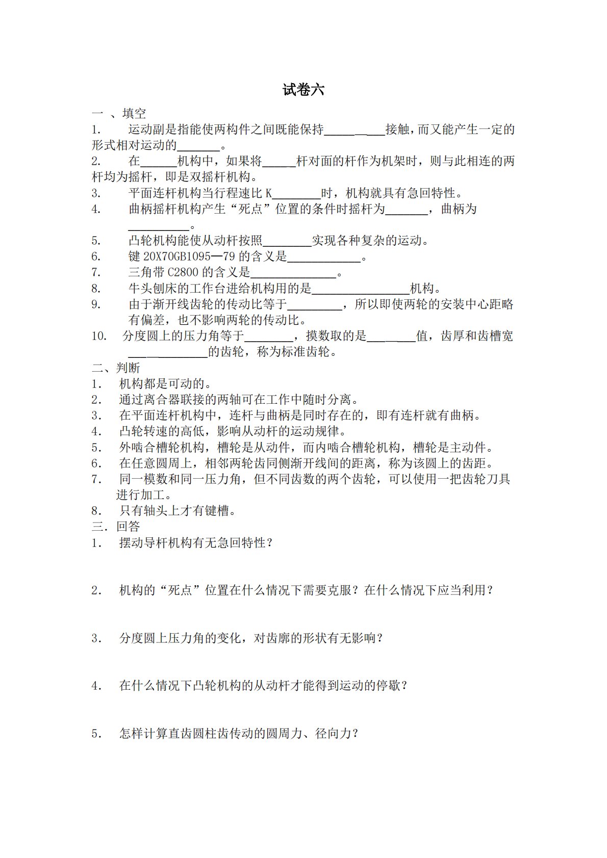试卷六一、填空1.运动副是指能使两构件之间既能保持________接触,而又能产生一定的形式相对运动的_______。2.在______机构中,如果将_____杆对面的杆作为机架时,则与此相连的两杆均为摇杆,即是双摇杆机构。3.平面连杆机构当行程速比K________时,机构就具有急回特性。4.曲柄摇杆机构产生“死点”位置的条件时摇杆为_______,曲柄为__________。5.凸轮机构能使从动杆按照________实现各种复杂的运动。6.键20X70GB1095—79的含义是____________。7.三角带C2800的含义是______________。8.牛头刨床的工作台进给机构用...