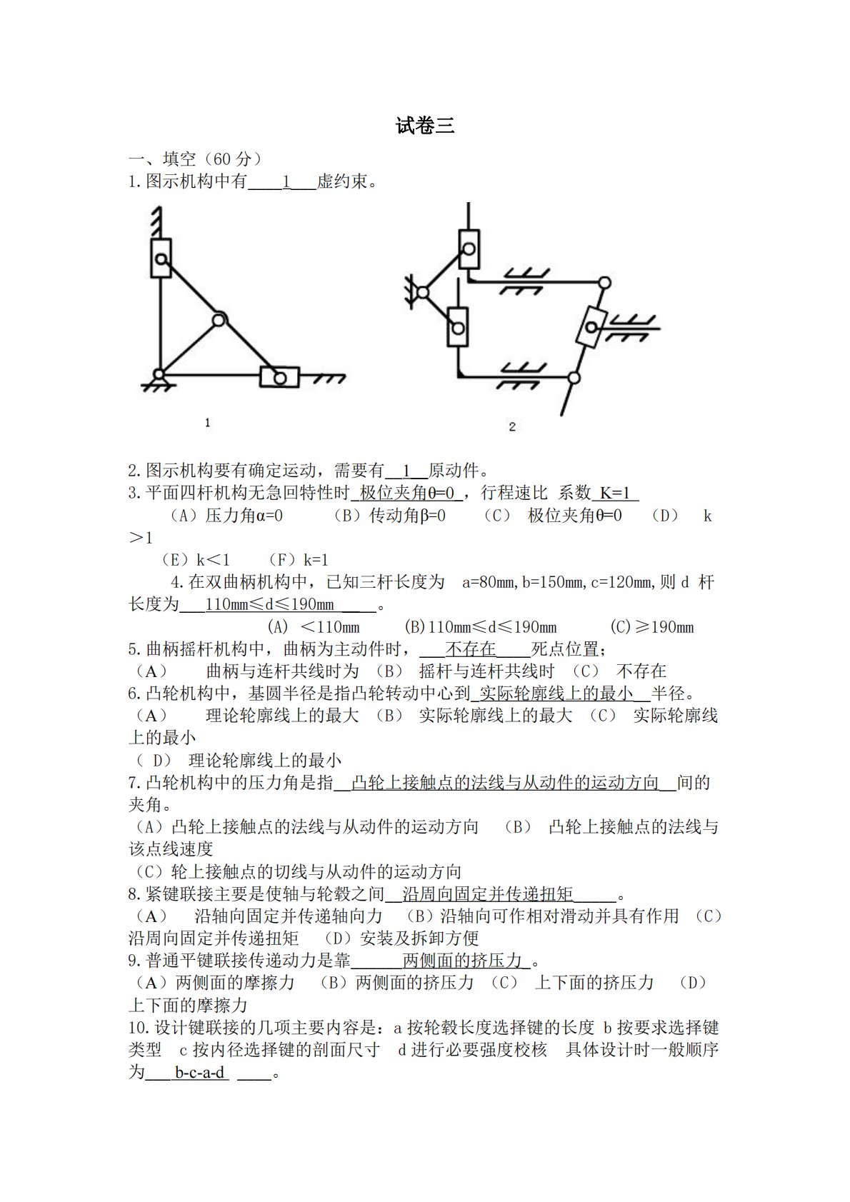 试卷三一、填空(60分)1.图示机构中有____1___虚约束。2.图示机构要有确定运动,需要有__1__原动件。3.平面四杆机构无急回特性时_极位夹角θ=0_,行程速比系数K=1(A)压力角α=0(B)传动角β=0(C)极位夹角θ=0(D)k>1(E)k<1(F)k=14.在双曲柄机构中,已知三杆长度为a=80mm,b=150mm,c=120mm,则d杆长度为___110mm≤d≤190mm____。(A)<110mm(B)110mm≤d≤190mm(C)≥190mm5.曲柄摇杆机构中,曲柄为主动件时,___不存在____死点位置;(A)曲柄与连杆共线时为(B)摇杆与连杆共线时(C)不存在6...