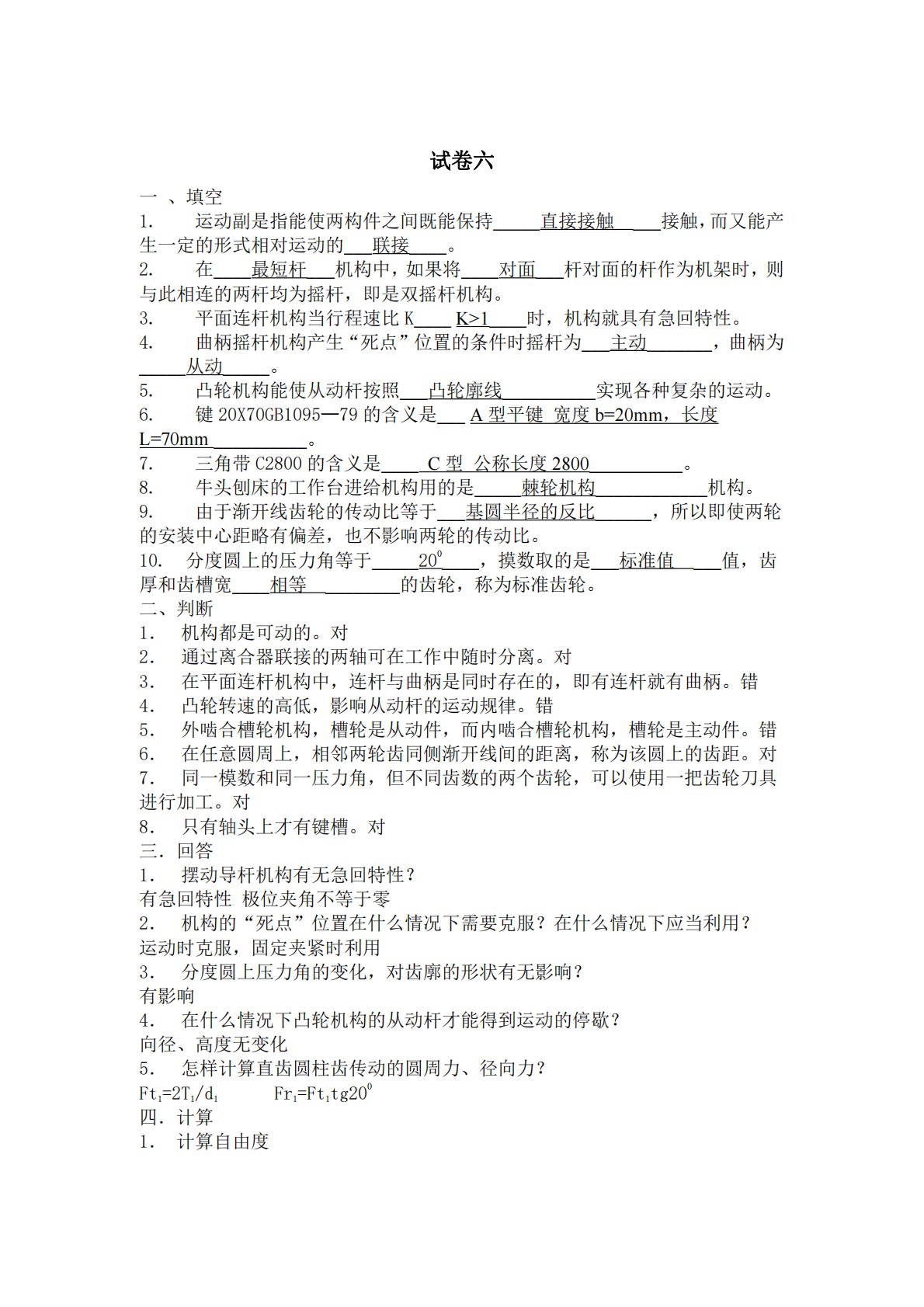 试卷六一、填空1.运动副是指能使两构件之间既能保持_____直接接触___接触,而又能产生一定的形式相对运动的___联接____。2.在____最短杆___机构中,如果将____对面___杆对面的杆作为机架时,则与此相连的两杆均为摇杆,即是双摇杆机构。3.平面连杆机构当行程速比K____K>1____时,机构就具有急回特性。4.曲柄摇杆机构产生“死点”位置的条件时摇杆为___主动_______,曲柄为_____从动_____。5.凸轮机构能使从动杆按照___凸轮廓线__________实现各种复杂的运动。6.键20X70GB1095—79的含义是___A型平键宽度b=20mm,长度L=70mm...