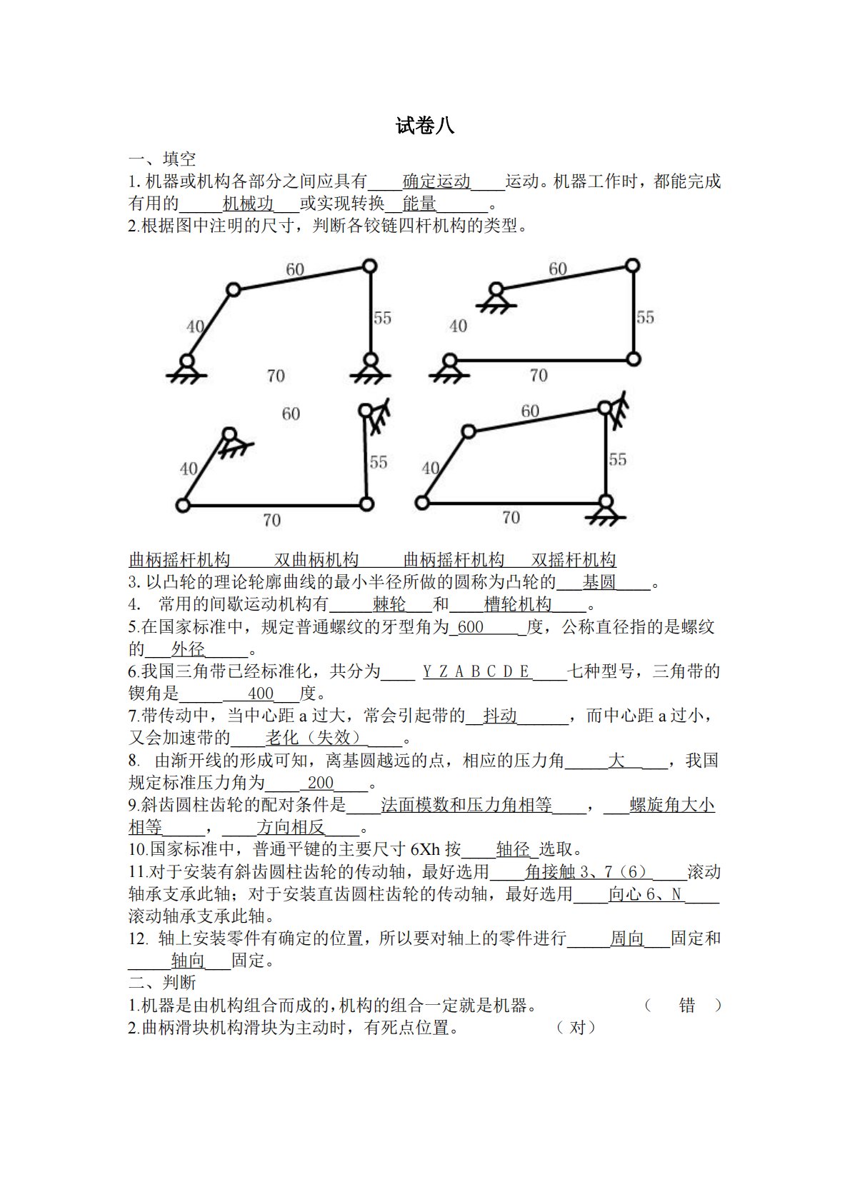 试卷八一、填空1.机器或机构各部分之间应具有____确定运动____运动。机器工作时,都能完成有用的_____机械功___或实现转换__能量______。2.根据图中注明的尺寸,判断各铰链四杆机构的类型。曲柄摇杆机构双曲柄机构曲柄摇杆机构双摇杆机构3.以凸轮的理论轮廓曲线的最小半径所做的圆称为凸轮的___基圆____。4.常用的间歇运动机构有_____棘轮___和____槽轮机构____。5.在国家标准中,规定普通螺纹的牙型角为_600_度,公称直径指的是螺纹的___外径_____。6.我国三角带已经标准化,共分为____YZABCDE____七种型号,三角带的锲角是_____400___度。...