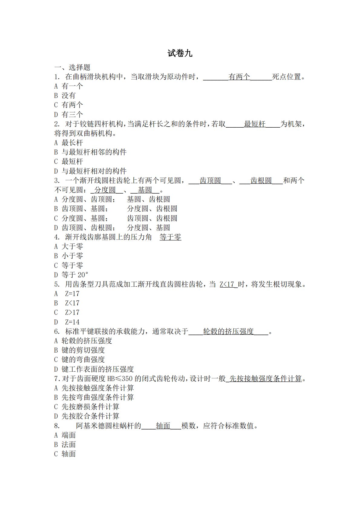 试卷九一、选择题1.在曲柄滑块机构中,当取滑块为原动件时,_______有两个______死点位置。A有一个B没有C有两个D有三个2.对于铰链四杆机构,当满足杆长之和的条件时,若取_____最短杆____为机架,将得到双曲柄机构。A最长杆B与最短杆相邻的构件C最短杆D与最短杆相对的构件3.一个渐开线圆柱齿轮上有两个可见圆,___齿顶圆___、___齿根圆___和两个不可见圆:_分度圆__、__基圆__。A分度圆、齿顶圆;基圆、齿根圆B齿顶圆、基圆;分度圆、齿根圆C分度圆、基圆;齿顶圆、齿根圆D齿顶圆、齿根圆;分度圆、基圆4.渐开线齿廓基圆上的压力角等于零A大于零B小于零C等于零D等于20°5....