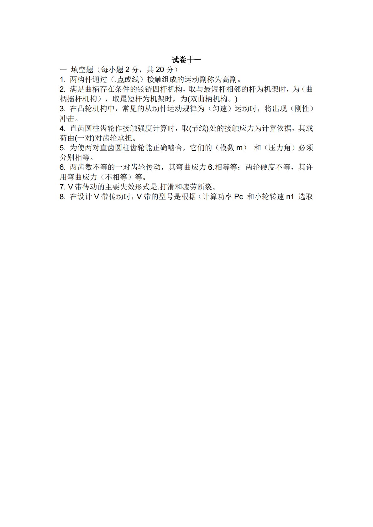 试卷十一一填空题(每小题2分,共20分)1.两构件通过(.点或线)接触组成的运动副称为高副。2.满足曲柄存在条件的铰链四杆机构,取与最短杆相邻的杆为机架时,为(曲柄摇杆机构),取最短杆为机架时,为(双曲柄机构。)3.在凸轮机构中,常见的从动件运动规律为(匀速)运动时,将出现(刚性)冲击。4.直齿圆柱齿轮作接触强度计算时,取(节线)处的接触应力为计算依据,其载荷由(一对)对齿轮承担。5.为使两对直齿圆柱齿轮能正确啮合,它们的(模数m)和(压力角)必须分别相等。6.两齿数不等的一对齿轮传动,其弯曲应力6.相等等;两轮硬度不等,其许用弯曲应力(不相等)等。7.V带传动的主要失效形式是.打滑和疲劳断裂...