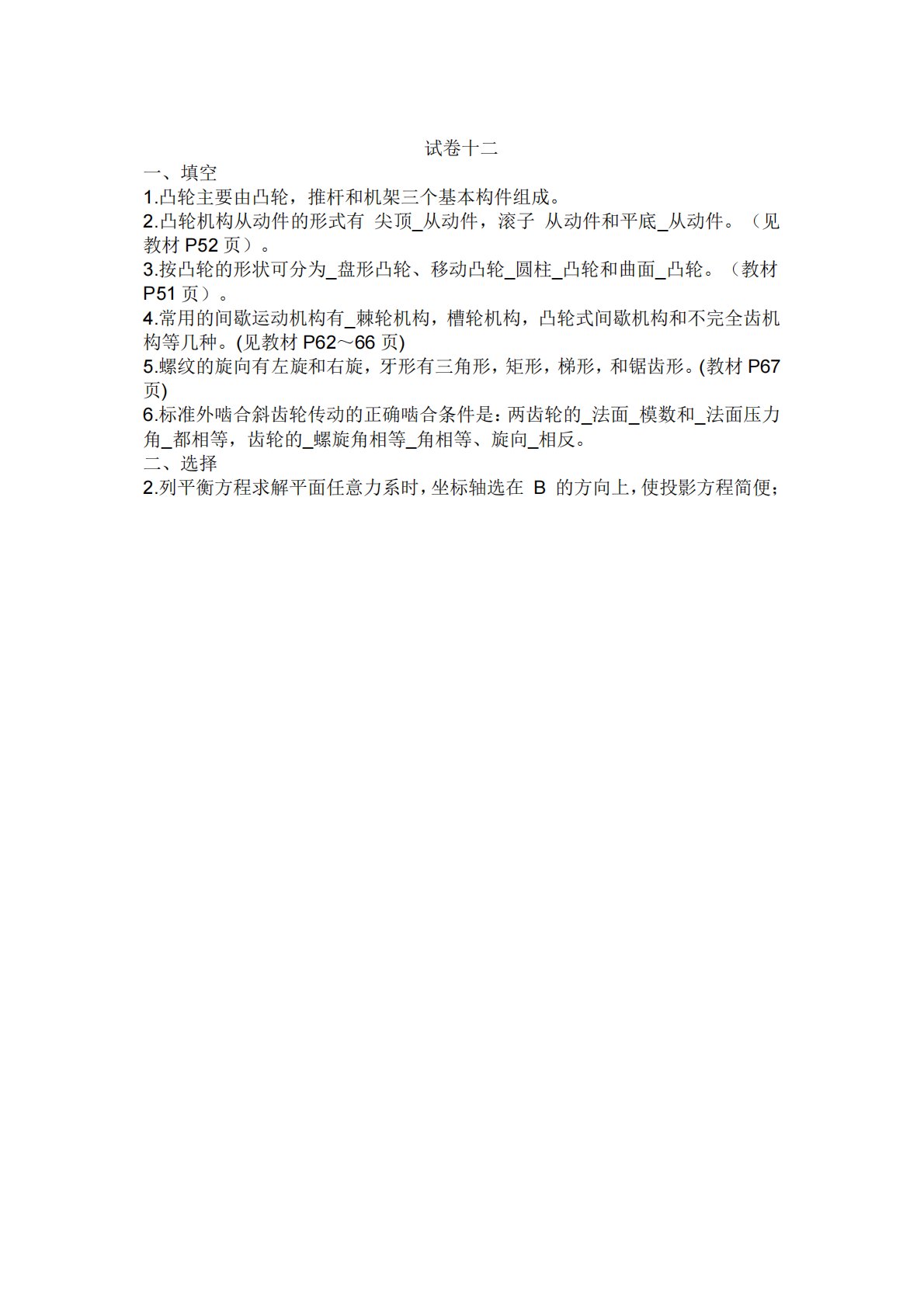 试卷十二一、填空1.凸轮主要由凸轮,推杆和机架三个基本构件组成。2.凸轮机构从动件的形式有尖顶_从动件,滚子从动件和平底_从动件。(见教材P52页)。3.按凸轮的形状可分为_盘形凸轮、移动凸轮_圆柱_凸轮和曲面_凸轮。(教材P51页)。4.常用的间歇运动机构有_棘轮机构,槽轮机构,凸轮式间歇机构和不完全齿机构等几种。(见教材P62~66页)5.螺纹的旋向有左旋和右旋,牙形有三角形,矩形,梯形,和锯齿形。(教材P67页)6.标准外啮合斜齿轮传动的正确啮合条件是:两齿轮的_法面_模数和_法面压力角_都相等,齿轮的_螺旋角相等_角相等、旋向_相反。二、选择2.列平衡方程求解平面任意力系时,坐标轴选在...