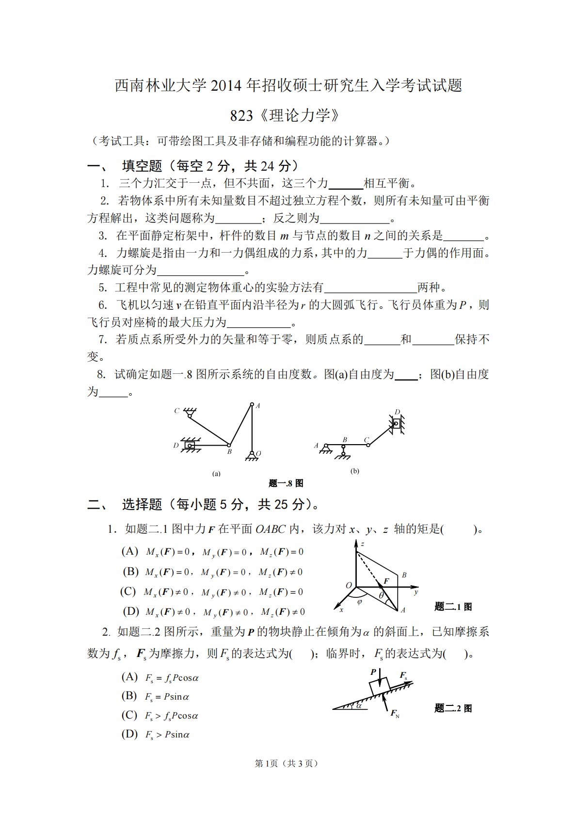 第1页(共3页)西南林业大学2014年招收硕士研究生入学考试试题823《理论力学》(考试工具:可带绘图工具及非存储和编程功能的计算器。)一、填空题(每空2分,共24分)1.三个力汇交于一点,但不共面,这三个力相互平衡。2.若物体系中所有未知量数目不超过独立方程个数,则所有未知量可由平衡方程解出,这类问题称为;反之则为。3.在平面静定桁架中,杆件的数目m与节点的数目n之间的关系是。4.力螺旋是指由一力和一力偶组成的力系,其中的力于力偶的作用面。力螺旋可分为。5.工程中常见的测定物体重心的实验方法有两种。6.飞机以匀速v在铅直平面内沿半径为r的大圆弧飞行。飞行员体重为P,则飞行员对座椅的最大压力为...