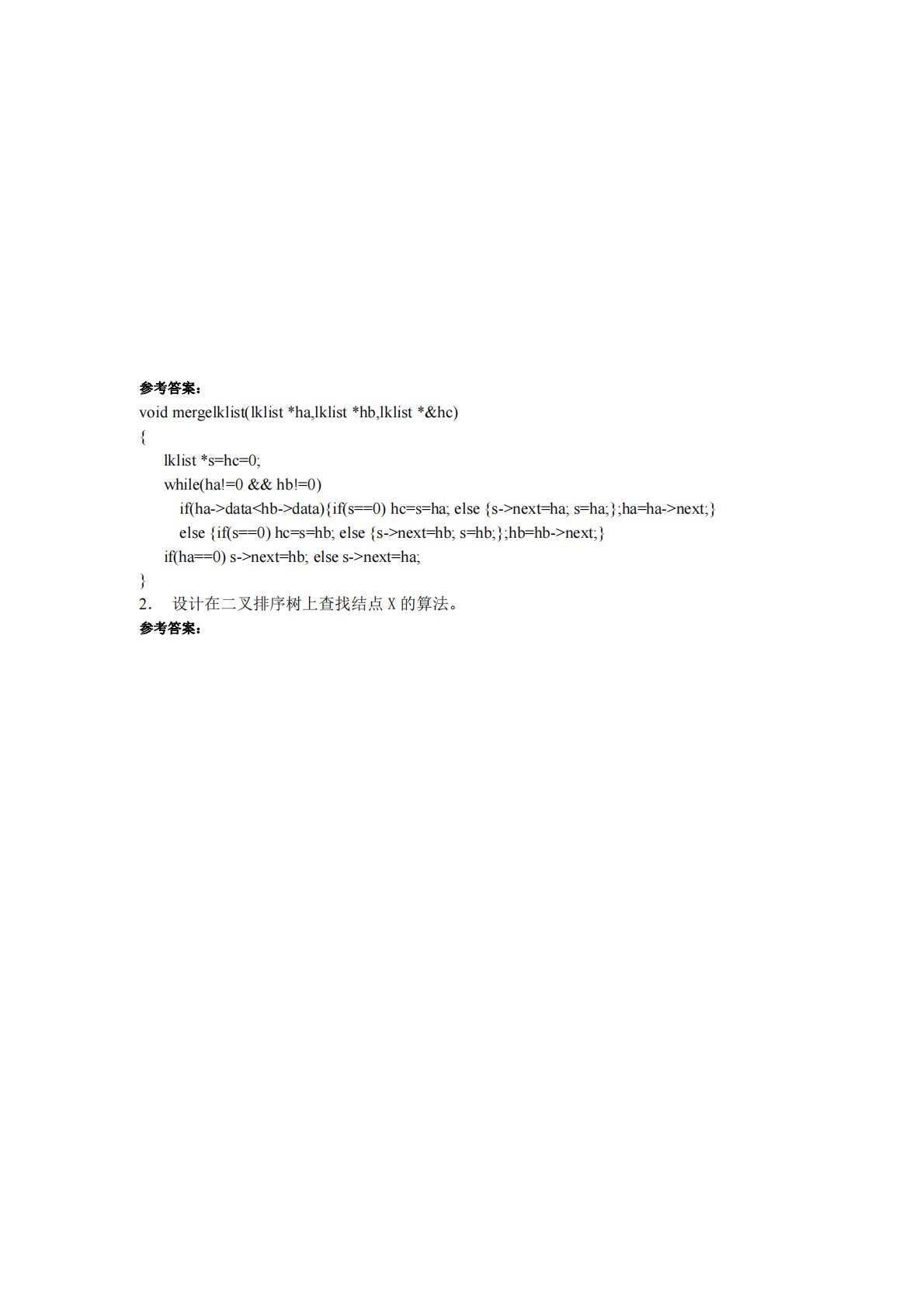 参考答案:voidmergelklist(lklist*ha,lklist*hb,lklist*&hc){lklist*s=hc=0;while(ha!=0&&hb!=0)if(ha->datadata){if(s==0)hc=s=ha;else{s->next=ha;s=ha;};ha=ha->next;}else{if(s==0)hc=s=hb;else{s->next=hb;s=hb;};hb=hb->next;}if(ha==0)s->next=hb;elses->next=ha;}2.设计在二叉排序树上查找结点X的算法。参考答案:参考答案:voidmergelklist(lklist...