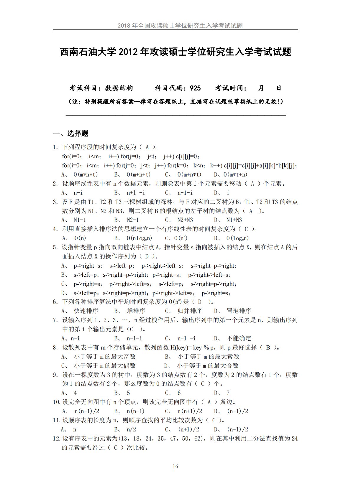 2018年全国攻读硕士学位研究生入学考试试题16西南石油大学2012年攻读硕士学位研究生入学考试试题考试科目:数据结构科目代码:925考试时间:月日(注:特别提醒所有答案一律写在答题纸上,直接写在试题或草稿纸上的无效!)———————————————————————————————一、选择题1.下列程序段的时间复杂度为(A)。for(i=0;i