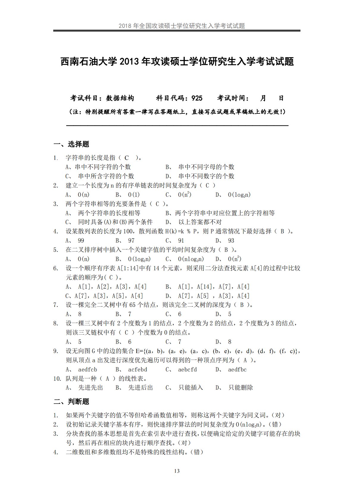 2018年全国攻读硕士学位研究生入学考试试题13西南石油大学2013年攻读硕士学位研究生入学考试试题考试科目:数据结构科目代码:925考试时间:月日(注:特别提醒所有答案一律写在答题纸上,直接写在试题或草稿纸上的无效!)———————————————————————————————一、选择题1.字符串的长度是指(C)。A、串中不同字符的个数B、串中不同字母的个数C、串中所含字符的个数D、串中不同数字的个数2.建立一个长度为n的有序单链表的时间复杂度为(C)A、O(n)B、O(1)C、O(n2)D、O(log2n)3.两个字符串相等的充要条件是(C)。A、两个字符串的长度相等B、两个字符串中对应...