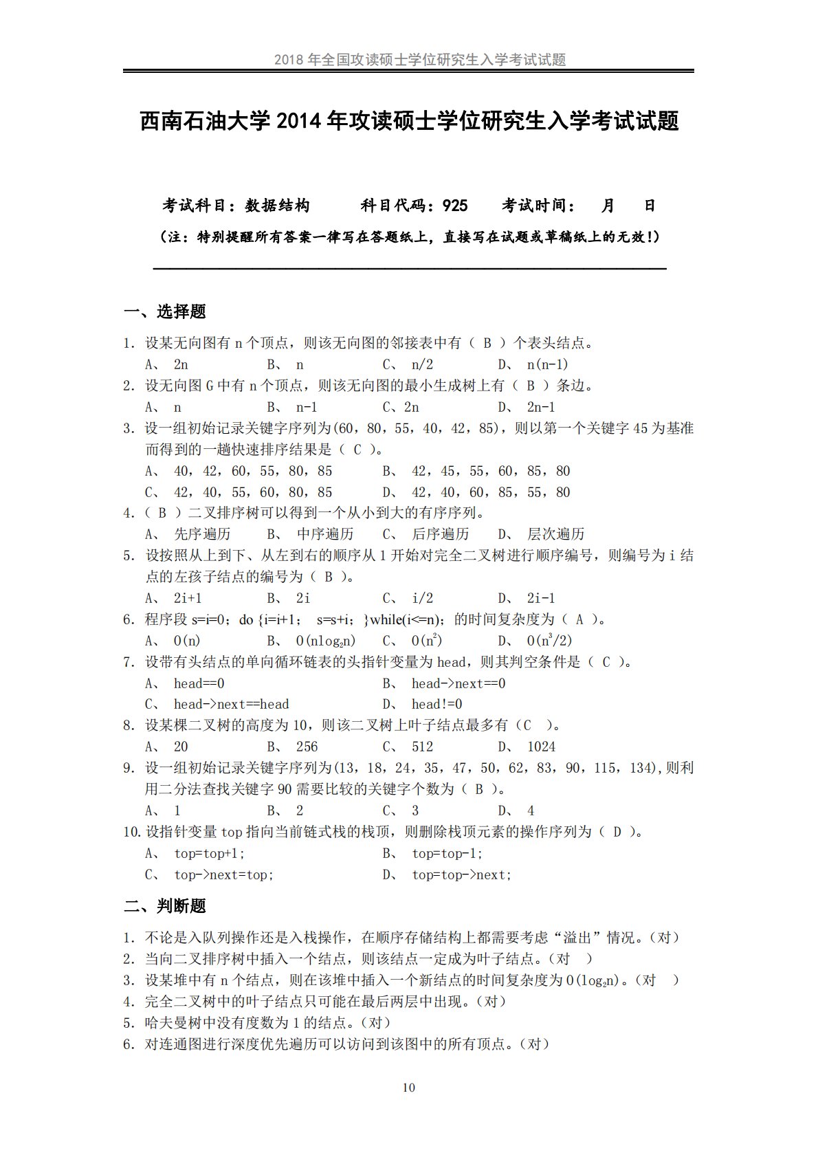 2018年全国攻读硕士学位研究生入学考试试题10西南石油大学2014年攻读硕士学位研究生入学考试试题考试科目:数据结构科目代码:925考试时间:月日(注:特别提醒所有答案一律写在答题纸上,直接写在试题或草稿纸上的无效!)———————————————————————————————一、选择题1.设某无向图有n个顶点,则该无向图的邻接表中有(B)个表头结点。A、2nB、nC、n/2D、n(n-1)2.设无向图G中有n个顶点,则该无向图的最小生成树上有(B)条边。A、nB、n-1C、2nD、2n-13.设一组初始记录关键字序列为(60,80,55,40,42,85),则以第一个关键字45为基准而得...