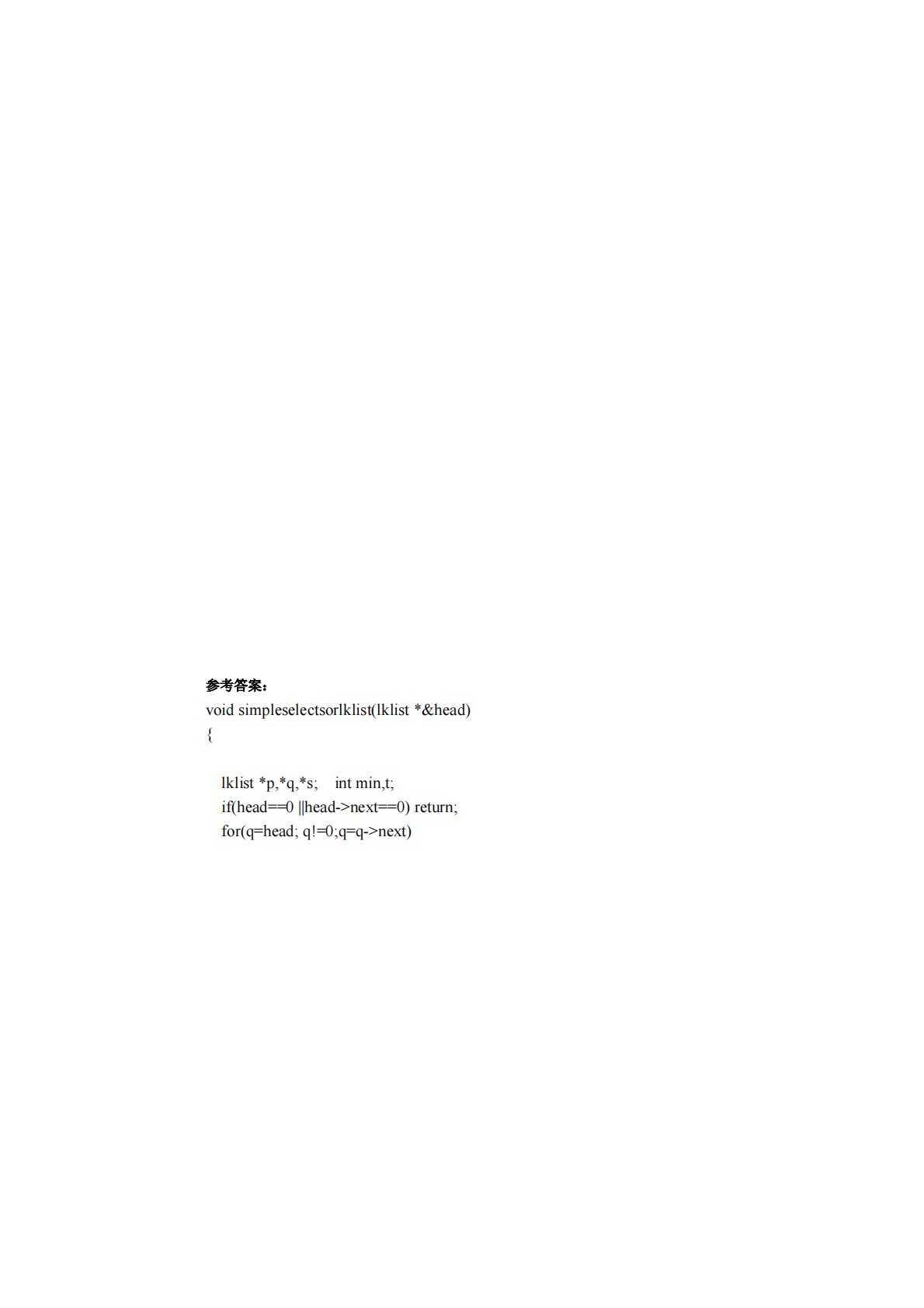 参考答案:voidsimpleselectsorlklist(lklist*&head){lklist*p,*q,*s;intmin,t;if(head==0||head->next==0)return;for(q=head;q!=0;q=q->next)2018年全国攻读硕士学位研究生入学考试试题12{min=q->data;s=q;for(p=q->next;p!=0;p=p->next)if(min>p->data){min=p->data;s=p;}if(s!=q){t=s->data;s->data=q->data;q->data=t;}}}2.设计在顺序存储结构上实现求子串算法。参...