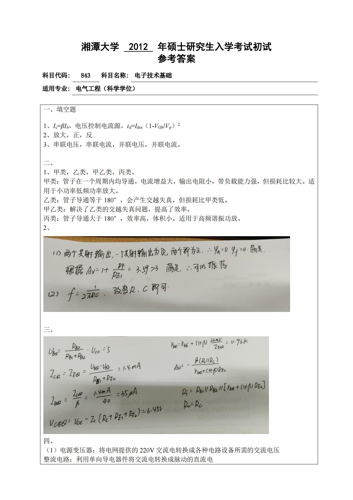 湘潭大学2012年硕士研究生入学考试初试参考答案科目代码:843科目名称:电子技术基础适用专业:电气工程(科学学位)一、填空题1、Ic=βIb,电压控制电流源,id=Idss(1-VGS/Vp)22、放大,正,反.3、串联电压,串联电流,并联电压,并联电流。二、1、甲类,乙类,甲乙类,丙类。甲类:管子在一个周期内均导通,电流增益大,输出电阻小,带负载能力强,但损耗比较大。适用于小功率低频功率放大。乙类:管子导通等于180°,会产生交越失真,但损耗比甲类低。甲乙类:解决了乙类的交越失真问题,提高了效率。丙类:管子导通大于180°,效率高,体积小。适用于高频谐振功放。2、三、四、(1)电源变压器:...